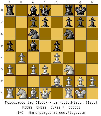 Last move : 1-0 2006 October 19 6:36:58 [Event "FICGS__CHESS__CLASS_F__000008"] [Site "FICGS"] [Date "2006.08.18"] [Round "1"] [White "Melquiades,Jay"] [Black "Jankovic,Mladen"] [Result "1-0"] [WhiteElo "1200"] [BlackElo "1200"] 1.e4 e5 2.Nf3 Nc6 3.c3 b5 4.Bxb5 a6 5.Be2 Nf6 6.a3 a5 7.d3 Bc5 8.O-O O-O 9.b4 1-0 This chess game has been lost on time (started : 2006.08.18 20:50:37) Ponziani Opening Kingside Castling by player White (move 8) Kingside Castling by player Black (move 8) Player White won this chess game. Follow this game move after move (download)With or without the title, Bobby Fischer was unquestionably the greatest player of his time. (Burt Hochberg) Schach ist ein Reich, wo sich die menschliche Phantasie frei entfalten kann. (David Bronstein) La última cosa en que Fischer estaba interesado era en tonterías, siempre y cuando el Ajedrez estuviera involucrado. (Elie Agur) J'ai toujours senti une vague pitié pour l'homme qui ne connaît rien aux échecs, tout comme j'en aurais pour un homme ignorant de l'amour. Les Echecs, comme la musique ou comme l'amour, ont le pouvoir de rendre heureux. (Siegbert Tarrasch) Chess, like love, like music, has the power to make people happy. (Siegbert Tarrasch)