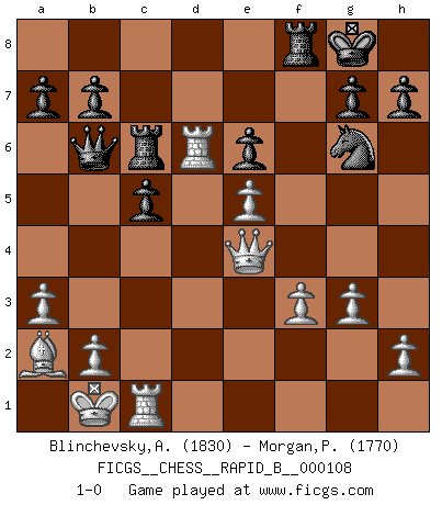 Last move : 1-0 2008 December 19 15:45:0 [Event "FICGS__CHESS__RAPID_B__000108"] [Site "FICGS"] [Date "2008.11.05"] [Round "1"] [White "Blinchevsky,Alexander"] [Black "Morgan,Peter"] [Result "1-0"] [WhiteElo "1830"] [BlackElo "1770"] 1.d4 Nf6 2.c4 e6 3.Nf3 Nc6 4.a3 Bd6 5.Nc3 O-O 6.e4 e5 7.Nxe5 Nxe5 8.c5 Bxc5 9.dxe5 Ne8 10.Be2 Qe7 11.Bf4 d6 12.Nd5 Qe6 13.exd6 Bxd6 14.f3 Bxf4 15.Nxf4 Qb6 16.Qc2 Be6 17.Nxe6 fxe6 18.O-O-O Nf6 19.Kb1 Rad8 20.Bc4 Nd7 21.Ba2 c5 22.Rhe1 Nf6 23.Rc1 Rc8 24.Red1 Nh5 25.e5 Rc6 26.Qe4 Nf4 27.g3 Ng6 28.Rd6 1-0 Queen's pawn game Kingside Castling by player Black (move 5) Queenside Castling by player White (move 18) Player White won this chess game. Follow this game move after move (download)Suddenly it was obvious to me in my analysis I had missed what Fischer had found with the greatest of ease at the board. (Mikhail Botvinnik) Intelligenz läßt sich nicht am Weg, sondern nur am Ergebnis feststellen. (Garry Kasparov) No nos podemos resistir a la fascinación de un sacrificio ya que la pasión por los sacrificios es parte de la naturaleza de un jugador de Ajedrez. (Rudolf Spielman) Tout change constamment, y compris dans le monde des Echecs. (Botvinnik) If everyone is thinking alike, then somebody isn't thinking. (US General George S. Patton)