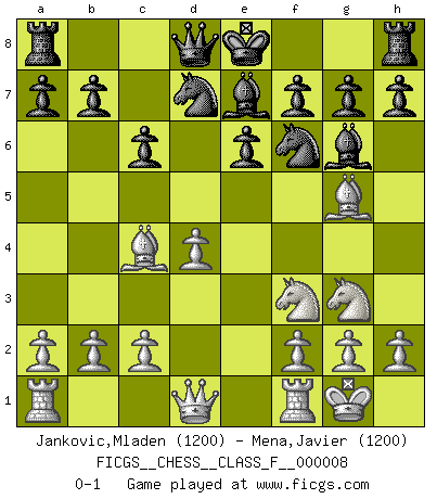 Last move : 0-1 2006 October 31 13:59:8 [Event "FICGS__CHESS__CLASS_F__000008"] [Site "FICGS"] [Date "2006.08.18"] [Round "1"] [White "Jankovic,Mladen"] [Black "Mena,Javier"] [Result "0-1"] [WhiteElo "1200"] [BlackElo "1200"] 1.e4 c6 2.d4 d5 3.Nc3 dxe4 4.Nxe4 Bf5 5.Ng3 Bg6 6.Nf3 e6 7.Bc4 Nf6 8.O-O Nbd7 9.Bg5 Be7 0-1 This chess game has been lost on time (started : 2006.08.18 20:50:37) Caro-Kann : Classical variation Kingside Castling by player White (move 8) Player Black won this chess game. Follow this game move after move (download)Chess is as much a mystery as women. (Purdy) Eine Person mit durchschnittlichem IQ kann etwa eine ELO von 2000 erreichen. (Jonathan Levitt) En un gambito tu regalas un Peón por el bién de tomar un juego perdido. (Samuel Standige Boden) Pour moi, les échecs ne sont pas un jeu mais un art. (Alexandre Alekhine) Wisdom doesn't necessarily come with age. Sometimes age just shows up all by itself. (Tom Wilson)