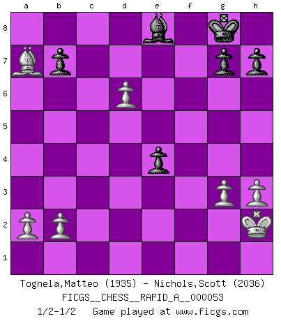 Last move : 1/2-1/2 2008 November 11 18:18:53 [Event "FICGS__CHESS__RAPID_A__000053"] [Site "FICGS"] [Date "2008.11.05"] [Round "1"] [White "Tognela,Matteo"] [Black "Nichols,Scott"] [Result "1/2-1/2"] [WhiteElo "1935"] [BlackElo "2036"] 1.Nf3 Nf6 2.g3 d5 3.Bg2 c6 4.O-O Bg4 5.d3 Nbd7 6.c4 e6 7.cxd5 exd5 8.Nc3 Be7 9.Qc2 O-O 10.e4 dxe4 11.dxe4 Bc5 12.Nh4 Re8 13.h3 Bh5 14.Kh2 Bb6 15.f4 Nc5 16.e5 Nd5 17.Nxd5 cxd5 18.Be3 Rc8 19.Qd2 Ne4 20.Bxe4 dxe4 21.Qxd8 Bxd8 22.Nf5 Rc2+ 23.Rf2 Rxf2+ 24.Bxf2 f6 25.Nd6 Re7 26.Rc1 Rc7 27.Rxc7 Bxc7 28.Bxa7 fxe5 29.fxe5 Bxd6 30.exd6 Be8 1/2-1/2 Reti Opening Kingside Castling by player White (move 4) Kingside Castling by player Black (move 9) This chess game ended in a draw. Follow this game move after move (download)Via the squares on the chessboard, the Indians explain the movement of time and the age, the higher influences which control the world and the ties which link Chess with the human soul. (Al-Masudi) Ein Teil des Fehlers ist immer korrekt. (Savielly Grigorievitsch Tartakower) Debes de llevar a tu oponente hacia un profundo y obscuro bosque donde 2+2=5, y el camino que conduce a la salida es suficientemente ancho para solamente uno. (Mikhail Tal) Les Echecs représentent une sphère d'idées créatrices basée sur la volonté des deux protagonistes. (Smyslov) Waiting for chance ? Play in casinos. (FICGS proverb)