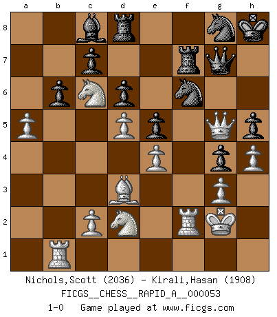 Last move : 1-0 2009 January 8 23:15:47 [Event "FICGS__CHESS__RAPID_A__000053"] [Site "FICGS"] [Date "2008.11.05"] [Round "1"] [White "Nichols,Scott"] [Black "Kirali,Hasan"] [Result "1-0"] [WhiteElo "2036"] [BlackElo "1908"] 1.e4 d6 2.d4 g6 3.Nc3 Bg7 4.Be2 Nf6 5.Nf3 O-O 6.O-O Bg4 7.Be3 Nc6 8.Qd2 e5 9.d5 Ne7 10.Rad1 Bd7 11.Bh6 Nh5 12.g3 Kh8 13.Bg5 f6 14.Bh6 Bh3 15.Bxg7+ Nxg7 16.Rfe1 g5 17.Kh1 Bd7 18.h4 g4 19.Nh2 Qc8 20.Rf1 a6 21.f3 Nh5 22.Rg1 f5 23.fxg4 fxg4 24.Qg5 Nf6 25.Rdf1 Neg8 26.Rf2 h6 27.Qe3 Qe8 28.Kg2 Qg6 29.Nf1 Rf7 30.Nd2 Raf8 31.Rgf1 Ne7 32.Qa7 Bc8 33.b4 Neg8 34.a4 Ne7 35.b5 axb5 36.Nxb5 Neg8 37.a5 h5 38.Qe3 Qg7 39.Qg5 Rd8 40.Bd3 R8d7 41.Na7 Rd8 42.Rb1 b6 43.Nc6 1-0 King's pawn Opening Kingside Castling by player Black (move 5) Kingside Castling by player White (move 6) Player White won this chess game. Follow this game move after move (download)Do you realize Fischer almost never has any bad pieces? He exchanges them, and the bad pieces remain with his opponents. (Yuri Balashov) Ich erzeugte keinen Neid, da mich die Schachspieler als Musiker und die Musiker als Schachspieler betrachteten. (Mark Taimanov) Yo siempre he tenido un ligero sentimiento de lástima por una persona que no tiene conocimiento del Ajedrez. (Siegbert Tarrasch) Les Cavaliers se révèlent fort utiles dans les positions fermées. D'habitude, les Fous sont un peu plus forts que les Cavaliers dans les positions ouvertes. Qu'on le veuille ou non, il restera toujours des exceptions ! Heh, heh, heh. Time to abandon ship. (General Grievous in Star Wars ep.3)