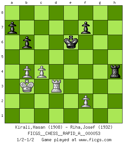 Last move : 1/2-1/2 2009 January 8 23:51:54 [Event "FICGS__CHESS__RAPID_A__000053"] [Site "FICGS"] [Date "2008.11.05"] [Round "1"] [White "Kirali,Hasan"] [Black "Riha,Josef"] [Result "1/2-1/2"] [WhiteElo "1908"] [BlackElo "1932"] 1.e4 e5 2.Nf3 Nf6 3.d4 d6 4.dxe5 Nxe4 5.Qd5 Nc5 6.Bg5 Qd7 7.exd6 Bxd6 8.Nc3 O-O 9.O-O-O Nc6 10.Nb5 Qf5 11.Qxf5 Bxf5 12.Be3 Ne4 13.Bd3 Rfe8 14.Nd2 Nxd2 15.Nxd6 cxd6 16.Bxf5 Nc4 17.Bf4 g6 18.Bh3 d5 19.Rxd5 Re4 20.Bd2 Re2 21.Rf1 Nxd2 22.Rxd2 Rxd2 23.Kxd2 Rd8+ 24.Kc1 Re8 25.c3 Kg7 26.Rd1 g5 27.Kc2 Re2+ 28.Rd2 Re1 29.Bc8 b6 30.Bb7 Ne5 31.Bd5 g4 32.c4 Ng6 33.b4 Nf4 34.Bc6 h5 35.g3 Ne6 36.a3 Kf6 37.Bg2 Ke7 38.Bb7 Kf6 39.Kb2 Kg6 40.Kb3 Rb1+ 41.Kc2 Ra1 42.Bd5 Rxa3 43.Kb2 Ra4 44.Be4+ Kf6 45.Kb3 Ra1 46.Rd5 Re1 47.Bd3 h4 48.gxh4 Rh1 49.Bf5 Rxh2 50.Bxg4 Rxh4 51.Bxe6 Kxe6 52.Rd3 1/2-1/2 Petrov : Modern (Steinitz) attack Kingside Castling by player Black (move 8) Queenside Castling by player White (move 9) 10 pieces endgame at move 51 : White KRPPP , Black KRPPP WHITE : King + 1 Rook 3 Pawns BLACK : King + 1 Rook 3 Pawns This chess game ended in a draw. Follow this game move after move (download)A win by an unsound combination, however showy, fills me with artistic horror. (Wilhelm Steinitz) Sehr viele beherrschen heutzutage das große Einmalseins des Schachspiels und kennen sogar dessen Logarithmentafeln auswendig - deshalb sollte man hin und wieder zu beweisen trachten, dass zwei mal zwei auch fünf sein kann. (Mikhail Nekhemyevich Tal) Si un gobernante no entiende al Ajedrez, ¿como puede governar él un reinado?. (El Rey Khusros II) On a dit que l'homme se distingue de l'animal par le fait qu'il achète plus de livres qu'il ne peut en lire. Je voudrais suggérer qu'inclure à la liste des livres quelques livres d'échecs rendrait la distinction manifeste. (Edward Lasker) I would love to change the world, but they won't give me the source code. (Unknown)