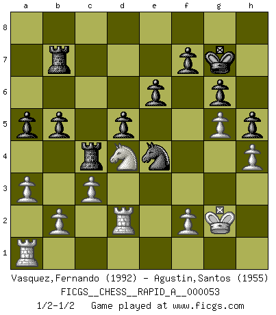 Last move : 1/2-1/2 2009 April 18 2:8:22 [Event "FICGS__CHESS__RAPID_A__000053"] [Site "FICGS"] [Date "2008.11.05"] [Round "1"] [White "Vasquez,Fernando"] [Black "Agustin,Santos"] [Result "1/2-1/2"] [WhiteElo "1992"] [BlackElo "1955"] 1.e4 c6 2.d4 d5 3.e5 Bf5 4.Nf3 e6 5.Be2 Ne7 6.Nc3 Ng6 7.Be3 Bg4 8.Qd3 Nd7 9.O-O Be7 10.a3 c5 11.Rfe1 O-O 12.h3 Bxf3 13.Bxf3 Qc7 14.Nb5 Qb8 15.Bh5 cxd4 16.Nxd4 Ngxe5 17.Qd1 a6 18.Be2 Qc7 19.Qd2 Rac8 20.Rad1 Nc5 21.Bf4 Bd6 22.c3 Nc4 23.Bxd6 Nxd6 24.Bd3 Qb6 25.Re2 Rfd8 26.Qf4 Nxd3 27.Rxd3 Ne4 28.Rd1 Re8 29.Qe3 Qc5 30.g3 Qc7 31.Kg2 Rcd8 32.h4 h6 33.Qf3 Rc8 34.Qe3 b5 35.Nb3 Nd6 36.Qf4 Red8 37.Nd4 Qd7 38.g4 Re8 39.Rde1 Nc4 40.g5 h5 41.Nf3 g6 42.Qf6 a5 43.Qd4 Qb7 44.Qf6 Qe7 45.Qxe7 Rxe7 46.Nd4 Rb7 47.Rc2 Kg7 48.Rec1 Nd6 49.Ra1 Rc4 50.Rd2 Ne4 1/2-1/2 Caro-Kann : Advance variation Kingside Castling by player White (move 9) Kingside Castling by player Black (move 11) This chess game ended in a draw. Follow this game move after move (download)You know you're going to lose. Even when I was ahead I knew I was going to lose. - On playing against Fischer. (Andrew Soltis) In Buenos Aires ist es nicht mein vorrangiges Ziel ein starkes Turnier zu organisieren, sondern ein Turnier für Gentlemen. Ich würde nie Kamsky einladen. Ich mag keine Probleme. (Miguel Najdorf) La maestría del Ajedrez consiste esencialmente en analizar posiciónes de Ajedrez con precisión. (Mikhail Botvinnik) Aux échecs, l'amour-propre est satisfait quand on remporte la victoire, mais il n'y a pas de honte à être battu. (Benjamin Franklin) Without enthusiasm, virtue functions not at all, and vice only poorly. (Mignon McLaughlin, The Neurotic's Notebook, 1960)