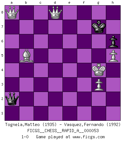 Last move : 1-0 2009 March 11 0:17:34 [Event "FICGS__CHESS__RAPID_A__000053"] [Site "FICGS"] [Date "2008.11.05"] [Round "1"] [White "Tognela,Matteo"] [Black "Vasquez,Fernando"] [Result "1-0"] [WhiteElo "1935"] [BlackElo "1992"] 1.Nf3 Nf6 2.g3 g6 3.b4 Bg7 4.Bb2 O-O 5.Bg2 a6 6.O-O Nc6 7.a3 d5 8.d3 Re8 9.Nbd2 e5 10.e4 d4 11.Qc1 Bh6 12.c3 Bg4 13.Qc2 dxc3 14.Bxc3 Bxd2 15.Qxd2 Qd7 16.Ne1 Nd4 17.f3 Be6 18.Qb2 Rac8 19.Rc1 c5 20.bxc5 Rxc5 21.Bxd4 Rb5 22.Bxe5 Rxb2 23.Bxb2 Nh5 24.d4 Rc8 25.Rxc8+ Qxc8 26.Rf2 Bc4 27.Nc2 f5 28.Ne3 Bb3 29.Nf1 Qc7 30.Bh3 Nf6 31.Rd2 fxe4 32.d5 Qd8 33.Bxf6 Qxf6 34.d6 exf3 35.d7 Qb6+ 36.Kh1 Qd8 37.Rd4 f2 38.Kg2 Kf7 39.Kxf2 Kf6 40.Nd2 Bc2 41.Rd6+ Kg7 42.Nf3 Ba4 43.Kg2 Bb5 44.Nd4 Kh8 45.Nxb5 axb5 46.Bg4 Kg7 47.h4 Kh8 48.Bf3 Kg7 49.Bxb7 Kf7 50.Bc6 h6 51.Bxb5 g5 52.h5 Ke7 53.Rd2 Kf6 54.Kh3 Kf7 55.Kg4 Kg7 56.a4 Kf7 57.a5 Kg8 58.a6 Kg7 59.a7 Qe7 60.d8Q Qe4+ 61.Kh3 Qh1+ 62.Rh2 g4+ 63.Kh4 Qxh2+ 64.Kxg4 Qa2 65.a8Q 1-0 Reti : King's Indian attack, Reti-Smyslov variation Kingside Castling by player Black (move 4) Kingside Castling by player White (move 6) Promotion Queen by player White (move 60) 10 pieces endgame at move 63 : White KQBPPP , Black KQPP WHITE : King + 1 Queen 1 Bishop 3 Pawns BLACK : King + 1 Queen 2 Pawns 9 pieces endgame at move 64 : White KQBPPP , Black KQP WHITE : King + 1 Queen 1 Bishop 3 Pawns BLACK : King + 1 Queen 1 Pawn Promotion Queen by player White (move 65) Player White won this chess game. Follow this game move after move (download)Chess is like war on a board. (Bobby Fischer) Du kannst im Schach nur gut werden, wenn du das Spiel liebst. (Robert James Fischer) Hasta este punto, las blancas han seguido un análisis bien conocido. Pero ahora el hace un error fatal: empieza a usar su propia cabeza. (Siegbert Tarrasch) C'est une question de caractère, Beaucoup de gens perdent leur motivation très vite. D'autres, ils sont rares, peuvent la conserver très longtemps. J'aime les échecs, encore aujourd'hui je suis heureux d'analyser des parties. J'aime toujours gagner, je déteste encore perdre. Bien jouer est important pour mon intégrité intellectuelle et morale. Et puis les échecs vivent en ce moment une période historique grâce à Internet. Ils se développent dans les systèmes éducatifs à travers le monde. Ils sortent de leur ghetto, et c'est mon rôle de mener à bien cette révolution. (Gary Kasparov) War is the child of passion, passion is the child of narcissism and narcissism is the child. (...) Another game ? (Thibault de Vassal)