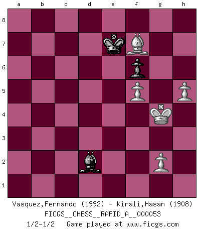 Last move : 1/2-1/2 2009 March 27 7:5:11 [Event "FICGS__CHESS__RAPID_A__000053"] [Site "FICGS"] [Date "2008.11.05"] [Round "1"] [White "Vasquez,Fernando"] [Black "Kirali,Hasan"] [Result "1/2-1/2"] [WhiteElo "1992"] [BlackElo "1908"] 1.e4 d6 2.d4 g6 3.Be2 Bg7 4.Nc3 Nf6 5.Nf3 O-O 6.O-O Bg4 7.Be3 Nc6 8.d5 Bxf3 9.Bxf3 Nb8 10.Qd2 Nbd7 11.Be2 c6 12.Rfe1 a6 13.dxc6 bxc6 14.Red1 Qc7 15.f4 Rfb8 16.b3 h6 17.Bf3 Rd8 18.Rab1 Rab8 19.h3 Ne8 20.Na4 e5 21.f5 gxf5 22.exf5 d5 23.Bxh6 e4 24.Be2 Be5 25.Qg5+ Ng7 26.c4 Bf6 27.Qf4 Be5 28.Qg4 Qd6 29.Bxg7 Bxg7 30.Qxe4 Nc5 31.Qg4 Nxa4 32.bxa4 Rxb1 33.Rxb1 Re8 34.cxd5 cxd5 35.Bf3 d4 36.Be2 Kf8 37.Qf3 Be5 38.Bd3 Qa3 39.Qd1 Rc8 40.Qd2 Qxa4 41.Qh6+ Ke7 42.Bxa6 Rb8 43.Qg5+ Kd7 44.Rxb8 Bxb8 45.Qf6 Qxa2 46.Qxd4+ Bd6 47.Bd3 Qa5 48.Qe4 Bg3 49.Kf1 Qa1+ 50.Ke2 Qe1+ 51.Kf3 Qxe4+ 52.Bxe4 Be1 53.Kg4 Kd6 54.h4 Ke5 55.Bc2 f6 56.Bb3 Bd2 57.Be6 Be1 58.Bf7 Bd2 59.Ba2 Ba5 60.h5 Bd2 61.Bb3 Kd6 62.Bf7 Ke7 1/2-1/2 King's pawn Opening Kingside Castling by player Black (move 5) Kingside Castling by player White (move 6) 10 pieces endgame at move 46 : White KQBPPP , Black KQBP WHITE : King + 1 Queen 1 Bishop 3 Pawns BLACK : King + 1 Queen 1 Bishop 1 Pawn 9 pieces endgame at move 51 : White KBPPP , Black KQBP WHITE : King + 1 Bishop 3 Pawns BLACK : King + 1 Queen 1 Bishop 1 Pawn 8 pieces endgame at move 52 : White KBPPP , Black KBP WHITE : King + 1 Bishop 3 Pawns BLACK : King + 1 Bishop 1 Pawn This chess game ended in a draw. Follow this game move after move (download)It is peculiar but a fact nevertheless, that gamblers in chess always have enthusiastic followers. (Botvinnik) Ich verachte Kasparow. (Viktor Kortschnoi) Un Peón pasado es un criminal, quién debe ser mantenido bajo candado y llave. Leves medidas, tales como vigilancia policiaca, no son suficientes. (Aaron Nimzovich) Mon pion favori sur ma case favorite ! Bronstein en parlant d'un coup de pion en h5 quand il avait les Noirs. Perseverance does not equal worthiness. Next time you want to get my attention, wear something fun. Low-riding jeans are hot. (Gregory House, House M.D.)