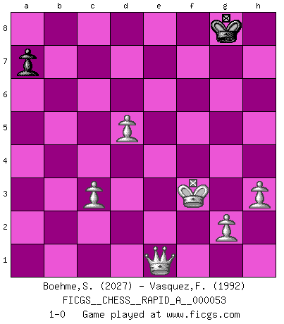 Last move : 1-0 2009 April 3 4:55:46 [Event "FICGS__CHESS__RAPID_A__000053"] [Site "FICGS"] [Date "2008.11.05"] [Round "1"] [White "Boehme,Sebastian"] [Black "Vasquez,Fernando"] [Result "1-0"] [WhiteElo "2027"] [BlackElo "1992"] 1.e4 e5 2.f4 exf4 3.Bc4 Nf6 4.Nc3 Nc6 5.d4 Bb4 6.Nge2 Nxe4 7.O-O O-O 8.Nxe4 d5 9.c3 Ba5 10.Bd3 dxe4 11.Bxe4 g5 12.Nxf4 gxf4 13.Qh5 f5 14.Bxc6 bxc6 15.Bxf4 Rf7 16.Rae1 Bd7 17.Bg5 Qf8 18.Bh6 Qd6 19.Rf3 f4 20.Re5 Bxc3 21.bxc3 Bf5 22.Rxf4 Bg6 23.Qg4 Qd7 24.Re6 Kh8 25.Rxg6 hxg6 26.Qxg6 Rxf4 27.Bxf4 Re8 28.Bg5 Re6 29.Bf6+ Rxf6 30.Qxf6+ Kh7 31.Qh4+ Kg7 32.Qg3+ Kf8 33.Qh3 Qd6 34.Qf5+ Kg8 35.h3 Qe7 36.Kf2 Qa3 37.Qc8+ Kf7 38.Qxc7+ Kf8 39.Qb8+ Kg7 40.Qb7+ Kh8 41.Qxc6 Qxa2+ 42.Kg3 Qg8+ 43.Kf3 Qf8+ 44.Ke3 Qe7+ 45.Qe4 Qa3 46.Qe5+ Kg8 47.d5 Qc1+ 48.Kf3 Qe1 49.Qxe1 1-0 KGA : Bishop's gambit, Bogolyubov variation Kingside Castling by player White (move 7) Kingside Castling by player Black (move 7) 10 pieces endgame at move 41 : White KQPPPPP , Black KQP WHITE : King + 1 Queen 5 Pawns BLACK : King + 1 Queen 1 Pawn 9 pieces endgame at move 41 : White KQPPPP , Black KQP WHITE : King + 1 Queen 4 Pawns BLACK : King + 1 Queen 1 Pawn 8 pieces endgame at move 49 : White KQPPPP , Black KP WHITE : King + 1 Queen 4 Pawns BLACK : King + 1 Pawn Player White won this chess game. Follow this game move after move (download)The combination player thinks forward; he starts from the given position, and tries the forceful moves in his mind. (Emanuel Lasker) Ich las kürzlich ein Buch von Nietzsche. Er sagte Religion verdumme nur die Menschen. Ich stimme zu. (Robert James Fischer) Algunos sacrificios son sólidos, los demás son míos. (Mikhail Tal) J'apprécie les joueurs d'est-indienne, c'est grâce à eux que je nourris ma famille depuis tant d'années. (Petrosian) There are more things in heaven and earth than practically anywhere else. (Unknown)