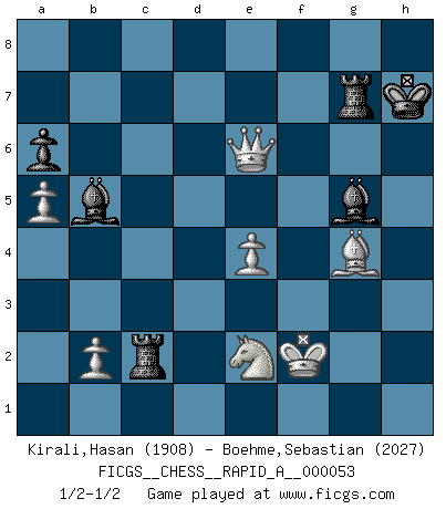 Last move : 1/2-1/2 2009 March 19 22:11:32 [Event "FICGS__CHESS__RAPID_A__000053"] [Site "FICGS"] [Date "2008.11.05"] [Round "1"] [White "Kirali,Hasan"] [Black "Boehme,Sebastian"] [Result "1/2-1/2"] [WhiteElo "1908"] [BlackElo "2027"] 1.e4 c5 2.Nf3 d6 3.d4 cxd4 4.Nxd4 Nf6 5.Nc3 a6 6.Be2 e6 7.O-O Be7 8.f4 O-O 9.Kh1 Qc7 10.a4 Nc6 11.Be3 Re8 12.Bf3 Rb8 13.Qd2 Bd7 14.Nb3 b6 15.g4 Bc8 16.g5 Nd7 17.Bg2 Bf8 18.Qf2 Bb7 19.Rad1 g6 20.Bc1 Nc5 21.f5 Ne5 22.Nxc5 bxc5 23.Bf4 c4 24.fxe6 fxe6 25.Bxe5 dxe5 26.Bh3 Bb4 27.Qh4 Bc8 28.Rf6 Bf8 29.Rdf1 Bg7 30.Rf7 Qxf7 31.Rxf7 Kxf7 32.Nd1 Bb7 33.Qe1 Rbc8 34.Nc3 Rc6 35.Qf2+ Kg8 36.Qa7 Re7 37.a5 Kf7 38.Qf2+ Kg8 39.Bg4 Rec7 40.Qd2 Bf8 41.Qd8 Rf7 42.Qe8 Kg7 43.h4 Rd6 44.Kg2 Bc6 45.Qc8 Bd7 46.Qxc4 h5 47.gxh6+ Kh7 48.h5 Bxh6 49.Qc5 Rd2+ 50.Ne2 gxh5 51.Bxh5 Rg7+ 52.Kf2 Bg5 53.Qxe5 Rxc2 54.Bg4 Bb5 55.Qxe6 1/2-1/2 Sicilian : Najdorf, Opovcensky variation Kingside Castling by player White (move 7) Kingside Castling by player Black (move 8) This chess game ended in a draw. Follow this game move after move (download)Castle early and often. (Rob Sillars) Ich bewundere Kasparows phantasievolle Angriffssiege aus den Achtzigern und Neunzigern, aber wenn man sie mit dem Computer überprüft, nimmt der Computer in jeder zweiten Partie die Opfer an, verteidigt sich und gewinnt. (Vladimir Kramnik) Bobby Fischer es el mas grande genio de Ajedrez de todos los tiempos. (Alexander Kotov) Les Echecs sont affaire de jugement sensible. Savoir quand frapper et quand esquiver. (Fischer) Inventor: A person who makes an ingenious arrangement of wheels, levers and springs, and believes it civilization. (Ambrose Bierce, The Devil's Dictionary)