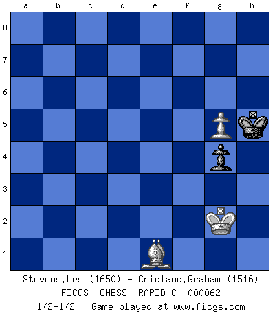 Last move : 1/2-1/2 2009 February 21 23:13:5 [Event "FICGS__CHESS__RAPID_C__000062"] [Site "FICGS"] [Date "2008.11.06"] [Round "1"] [White "Stevens,Les"] [Black "Cridland,Graham"] [Result "1/2-1/2"] [WhiteElo "1650"] [BlackElo "1516"] 1.c4 e5 2.Nc3 Nc6 3.g3 Nf6 4.Bg2 Bb4 5.Qb3 a5 6.Nf3 O-O 7.O-O a4 8.Nxa4 d5 9.Nxe5 dxc4 10.Nxc4 Qe7 11.Ne3 Be6 12.Qc2 Nd4 13.Qd3 Rfd8 14.Nd5 Nxe2+ 15.Qxe2 Nxd5 16.Nc3 Qc5 17.Nxd5 Bxd5 18.Rd1 Bxg2 19.Kxg2 Qd5+ 20.Kg1 Rxa2 21.Rxa2 Qxa2 22.d4 Qd5 23.Be3 h6 24.Qg4 h5 25.Qh4 Rd7 26.Ra1 b6 27.Ra4 Be7 28.Qh3 Rd8 29.Bf4 Qc6 30.b3 g6 31.Rc4 Bc5 32.Be5 Qf3 33.Bxc7 Rxd4 34.Rxd4 Bxd4 35.Qg2 Qd1+ 36.Qf1 Qxb3 37.Qe2 Qb2 38.Qxb2 Bxb2 39.Bxb6 Kg7 40.Kg2 Kf6 41.Kf3 Kf5 42.h3 Bc3 43.Ke3 g5 44.f3 g4 45.fxg4+ hxg4 46.h4 Be5 47.Kf2 Ke4 48.Ba7 f5 49.Bc5 f4 50.gxf4 Kxf4 51.Be3+ Kf5 52.Kg2 Ke4 53.Bh6 Bf4 54.Bg7 Kf5 55.Bd4 Kg6 56.Bf2 Kh5 57.Be1 Bg5 58.hxg5 1/2-1/2 English : Sicilian Reversed Kingside Castling by player Black (move 6) Kingside Castling by player White (move 7) 10 pieces endgame at move 39 : White KBPPP , Black KBPPP WHITE : King + 1 Bishop 3 Pawns BLACK : King + 1 Bishop 3 Pawns 9 pieces endgame at move 45 : White KBPPP , Black KBPP WHITE : King + 1 Bishop 3 Pawns BLACK : King + 1 Bishop 2 Pawns 8 pieces endgame at move 45 : White KBPP , Black KBPP WHITE : King + 1 Bishop 2 Pawns BLACK : King + 1 Bishop 2 Pawns 7 pieces endgame at move 50 : White KBPP , Black KBP WHITE : King + 1 Bishop 2 Pawns BLACK : King + 1 Bishop 1 Pawn 6 pieces endgame at move 50 : White KBP , Black KBP WHITE : King + 1 Bishop 1 Pawn BLACK : King + 1 Bishop 1 Pawn 5 pieces endgame at move 58 : White KBP , Black KP WHITE : King + 1 Bishop 1 Pawn BLACK : King + 1 Pawn This chess game ended in a draw. Follow this game move after move (download)With or without the title, Bobby Fischer was unquestionably the greatest player of his time. (Burt Hochberg) Schach ist eine Sache der genauen Beurteilung, wann man zuschlagen und wann man sich ducken muss. (Robert James Fischer) Ciertamente el estado mental actual de Bobby Fischer es una tragedia. Uno de los mas grandes jugadores de Ajedrez del mundo -el orgullo y pena del Ajedrez Americano. (Frank Brady) La tactique, c'est ce que vous faites quand il y a quelque chose à faire; la stratégie, c'est ce que vous faites quand il n'y a rien à faire. (Savielli Tartacower) Shallow men believe in luck. Strong men belive in cause and effect. (Ralph Waldo Emerson)