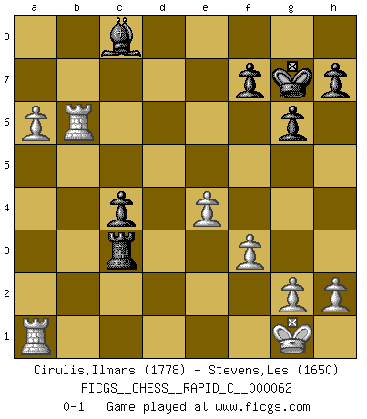 Last move : 0-1 2009 February 9 8:52:0 [Event "FICGS__CHESS__RAPID_C__000062"] [Site "FICGS"] [Date "2008.11.06"] [Round "1"] [White "Cirulis,Ilmars"] [Black "Stevens,Les"] [Result "0-1"] [WhiteElo "1778"] [BlackElo "1650"] 1.d4 Nf6 2.c4 g6 3.Nc3 d5 4.cxd5 Nxd5 5.e4 Nxc3 6.bxc3 Bg7 7.Nf3 b6 8.Bf4 Bb7 9.Bd3 O-O 10.O-O Re8 11.Qc2 Nc6 12.Rad1 e5 13.dxe5 Nxe5 14.Bxe5 Bxe5 15.Bb5 Qf6 16.Bxe8 Rxe8 17.Nxe5 Qxe5 18.f3 Kg7 19.Qa4 a5 20.Qd4 Ba6 21.Rfe1 c6 22.Qxb6 Bb5 23.Qxa5 Qc5+ 24.Rd4 Re5 25.a4 Bc4 26.Qxc5 Rxc5 27.a5 Ba6 28.Ra1 Rxc3 29.Rb4 c5 30.Rb6 Bc8 31.a6 c4 0-1 This chess game has been lost on time (started : 2008.11.06 10:2:7) King's Indian defense, 3.Nc3 Kingside Castling by player Black (move 9) Kingside Castling by player White (move 10) Player Black won this chess game. Follow this game move after move (download)Chess is as much a mystery as women. (Purdy) Deine Wertungszahl - vorausgesetzt einige Jahre schachliche Anstrengung - entspricht etwa dem zehnfachen Deines IQ plus 1000. (Jonathan Levitt) Por tratar de evitar la pérdida de una pieza, muchas personas han perdido una partida de Ajedrez. (Savielly Tartakover) Il n'y a pas de prix trop élevé au scalp de l'ennemi. (Koblentz) He is a liar. I just don't know what the lie is yet. (Horatio Caine, C.S.I. Miami)