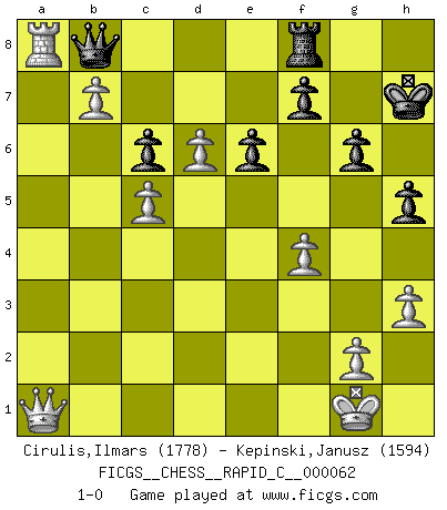 Last move : 1-0 2009 March 1 16:25:39 [Event "FICGS__CHESS__RAPID_C__000062"] [Site "FICGS"] [Date "2008.11.06"] [Round "1"] [White "Cirulis,Ilmars"] [Black "Kepinski,Janusz"] [Result "1-0"] [WhiteElo "1778"] [BlackElo "1594"] 1.d4 d5 2.f4 Nf6 3.e3 c5 4.Nf3 Bg4 5.dxc5 e6 6.b4 a5 7.c3 Be7 8.Bb5+ Nc6 9.Bb2 O-O 10.a3 Ne4 11.O-O h6 12.Nbd2 Nf6 13.Qb3 Qc7 14.c4 axb4 15.axb4 dxc4 16.Nxc4 Nd5 17.Rxa8 Rxa8 18.Bxc6 bxc6 19.e4 Bxf3 20.Rxf3 Nf6 21.Bxf6 Bxf6 22.e5 Be7 23.Nd6 Qd7 24.Rf1 Bxd6 25.exd6 g6 26.Qc3 Rd8 27.Ra1 Qb7 28.Ra5 Rd7 29.b5 Rd8 30.b6 h5 31.Ra7 Qb8 32.Qf6 Rf8 33.h3 Qe8 34.b7 Qb8 35.Qa1 Kh7 36.Ra8 1-0 Queen's pawn game Kingside Castling by player Black (move 9) Kingside Castling by player White (move 11) Player White won this chess game. Follow this game move after move (download)Chess mastery essentially consists of analyzing Chess positions accurately. (Mikhail Botvinnik) Die Elozahlen sind sehr schlecht für das Schach. Jetzt ist Schach eine Sportindustrie, die darauf zielt Elopunkte zu machen. (Miguel Najdorf) Yo tuve un dolor de muelas en la primer partida. En el segundo juego, tuve un dolor de cabeza. En el tercero, tuve un ataque de reumatísmo. En la cuarta partida, no me sentía muy bien. ¿Y en el quinto juego? Bueno, ¿que acaso uno tiene que ganar todos los juegos?. (Siegbert Tarrasch) Les échecs sont utiles à l'exercice de la faculté de penser et à celle de l'imagination. Car nous devons posséder une méthode élaborée pour atteindre des buts partout où nous devons conduire notre raison. (Leibnitz) Big Chess is a place for big hallucinations. (Thibault de Vassal)