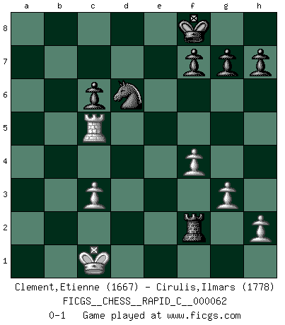 Last move : 0-1 2009 February 14 9:7:46 [Event "FICGS__CHESS__RAPID_C__000062"] [Site "FICGS"] [Date "2008.11.06"] [Round "1"] [White "Clement,Etienne"] [Black "Cirulis,Ilmars"] [Result "0-1"] [WhiteElo "1667"] [BlackElo "1778"] 1.c4 e5 2.Nc3 Nf6 3.d4 exd4 4.Qxd4 Nc6 5.Qd1 Bb4 6.Qc2 O-O 7.Bg5 Re8 8.O-O-O Bxc3 9.Qxc3 Ne4 10.Bxd8 Nxc3 11.bxc3 Nxd8 12.Nf3 d6 13.Nd4 Re5 14.g3 Nc6 15.Nb5 Re7 16.Bg2 Bg4 17.Bf3 Bxf3 18.exf3 Ne5 19.c5 dxc5 20.f4 Nc4 21.Rhe1 Rxe1 22.Rxe1 c6 23.Nxa7 Kf8 24.Nxc6 Rxa2 25.Re4 Nd6 26.Re5 bxc6 27.Rxc5 Rxf2 0-1 This chess game has been lost on time (started : 2008.11.06 10:2:7) English Opening Kingside Castling by player Black (move 6) Queenside Castling by player White (move 8) Player Black won this chess game. Follow this game move after move (download)When you don't know what to play, wait for an idea to come into your opponent's mind. You may be sure that idea will be wrong. (Siegbert Tarrasch) Wenn es im Universum noch irgendwo intelligente Lebewesen gibt, dann kennen sie Go. (Emanuel Lasker) Personalmente, yo prefiero mirar hacia el futuro en donde un programa de computadora gane el título mundial de Ajedrez. La humanidad necesita una lección de humildad. (Richard Dawkings) Une platitude souvent récitée à propos des Echecs est qu'une des choses les plus difficiles à réaliser est de gagner une position gagnante. Cela ne manque pas de sens mais, pour ma part, j'ai toujours trouvé plus difficile de gagner une position perdante. (Tim Krabbe) Luck is when opportunity knocks and you answer. (Anonymous)