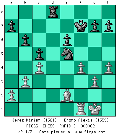 Last move : 1/2-1/2 2009 January 14 9:9:35 [Event "FICGS__CHESS__RAPID_C__000062"] [Site "FICGS"] [Date "2008.11.06"] [Round "1"] [White "Jerez,Miriam"] [Black "Bromo,Alexis"] [Result "1/2-1/2"] [WhiteElo "1561"] [BlackElo "1559"] 1.e4 e6 2.Nf3 d6 3.d4 b6 4.Nc3 Bb7 5.Bd3 Nf6 6.O-O Be7 7.Be3 O-O 8.e5 Nd5 9.Nxd5 Bxd5 10.c4 Bb7 11.Be2 Nd7 12.b3 c5 13.d5 dxe5 14.dxe6 fxe6 15.Qc2 e4 16.Nd2 Bf6 17.Rad1 Bg5 18.Bxg5 Qxg5 19.Nxe4 Bxe4 20.Qxe4 Qe7 21.Qb7 Rfd8 22.g3 Qf7 23.h4 Ne5 24.Qxf7+ Kxf7 25.Rxd8 Rxd8 26.f4 1/2-1/2 French defense Kingside Castling by player White (move 6) Kingside Castling by player Black (move 7) This chess game ended in a draw. Follow this game move after move (download)Before the endgame, the Gods have placed the middle game. (Siegbert Tarrasch) Um dein Spiel zu verbessern musst du zuallererst das Endspiel studieren, denn diese kann unabhängig studiert werden. Die Eröffnung und das Mittelspiel müssen immer in Bezug gesetzt werden zum Endspiel. (José Raúl Capablanca) El Ajedrez lo es todo: arte, ciencia y deporte. (Anatoly Karpov) Les pièces de l'échiquier étaient impitoyables. Elles le retenaient, elles l'absorbaient. Il y avait de l'horreur en cela, mais aussi une harmonie unique. Car, qu'y a-t-il dans le monde, à part les échecs ? (V. Nabokov) In every real man a child is hidden that wants to play. (Friedrich Nietzsche)