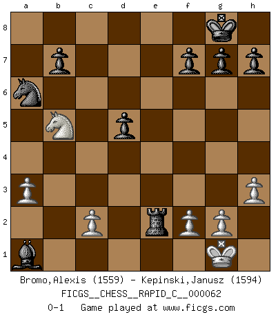 Last move : 0-1 2008 December 13 9:6:54 [Event "FICGS__CHESS__RAPID_C__000062"] [Site "FICGS"] [Date "2008.11.06"] [Round "1"] [White "Bromo,Alexis"] [Black "Kepinski,Janusz"] [Result "0-1"] [WhiteElo "1559"] [BlackElo "1594"] 1.e4 e6 2.Nf3 d5 3.exd5 exd5 4.d4 Bg4 5.Be2 Bd6 6.h3 Bh5 7.Nc3 Nf6 8.Bg5 c6 9.O-O O-O 10.Re1 Re8 11.Bxf6 Qxf6 12.Ne5 Bxe2 13.Qxe2 Re6 14.a3 Na6 15.b4 Rae8 16.Qf3 Bxe5 17.Qxf6 Bxf6 18.Rxe6 Rxe6 19.b5 cxb5 20.Nxb5 Re2 21.Nxa7 Bxd4 22.Nb5 Bxa1 0-1 French defense Kingside Castling by player White (move 9) Kingside Castling by player Black (move 9) Player Black won this chess game. Follow this game move after move (download)It is not enough to be a good player... you must also play well. (Siegbert Tarrasch) Es ist schade, dass viele Schachsportler vergessen, wie wichtig Auftreten und angemessene Kleidung sind. (Alexandra Kosteniuk) El Ajedrez es un regaderazo frío para la mente. (Sir John Simon) Ce qui est bien, c'est d'avoir tout un tas de pièces en prise : l'adversaire ne peut en prendre qu'une à la fois. Cité par Thierry Audin. But they are useless. They can only give you answers. (Pablo Picasso, about computers)