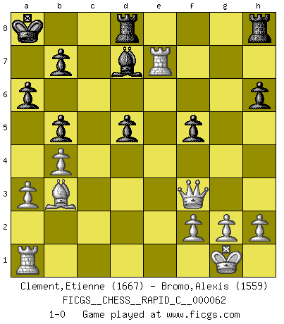 Last move : 1-0 2008 December 22 6:48:21 [Event "FICGS__CHESS__RAPID_C__000062"] [Site "FICGS"] [Date "2008.11.06"] [Round "1"] [White "Clement,Etienne"] [Black "Bromo,Alexis"] [Result "1-0"] [WhiteElo "1667"] [BlackElo "1559"] 1.d4 d5 2.Nf3 Nf6 3.c4 dxc4 4.Nc3 e6 5.e4 Nc6 6.Bxc4 Bb4 7.e5 Ne4 8.Qc2 h6 9.Qxe4 Bd7 10.O-O Qe7 11.Nb5 O-O-O 12.Be3 a6 13.Nc3 f5 14.exf6 gxf6 15.a3 Ba5 16.b4 Bb6 17.Na4 f5 18.Nxb6+ cxb6 19.Qd3 b5 20.Bb3 Kb8 21.Rfe1 Ka8 22.d5 exd5 23.Bd4 Nxd4 24.Rxe7 Nxf3+ 25.Qxf3 1-0 Queen's pawn game Kingside Castling by player White (move 10) Queenside Castling by player Black (move 11) Player White won this chess game. Follow this game move after move (download)When I have White, I win because I am white; When I have Black, I win because I am Bogolyubov. (Bogolyubov) Nur ein wirklich starker Spieler weiß wie schwach er spielt. (Savielly Grigorievitsch Tartakower) Es el objetivo de la escuela moderna no tratar cada posición de acuerdo a una regla general, sino de acuerdo al principio inherente en la posición. (Richard Reti) C'est la seule position que je connaisse où les deux camps sont mals. Propos prêtés à V. Anand. He who laughs last probably does not get the joke. (Unknown)
