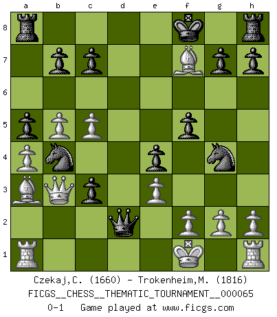 Last move : 0-1 2009 January 16 13:21:26 [Event "FICGS__CHESS__THEMATIC_TOURNAMENT__000065"] [Site "FICGS"] [Date "2008.11.08"] [Round "1"] [White "Czekaj,Christophe"] [Black "Trokenheim,Marek"] [Result "0-1"] [WhiteElo "1660"] [BlackElo "1816"] 1.b4 d5 2.Bb2 Qd6 3.a3 e5 4.e3 Be6 5.Nf3 f6 6.d4 e4 7.Nfd2 f5 8.c4 Nf6 9.c5 Qd7 10.Nc3 a6 11.a4 Nc6 12.Qb3 a5 13.b5 Nb4 14.Ba3 Bxc5 15.dxc5 d4 16.Bc4 dxc3 17.Bxe6 Qxd2+ 18.Kf1 Ng4 19.Bf7+ Kf8 0-1 Polish (Sokolsky) opening Player Black won this chess game. Follow this game move after move (download)Chess holds its master in its own bonds, shackling the mind and brain so that the inner freedom of the very strongest must suffer. (Albert Einstein) Rubinstein ist ein Turmendspiel, welches die Götter vor tausenden von Jahren begannen. (Savielly Grigorievitsch Tartakower) El estómago es una parte esencial del maestro de Ajedrez. (Bent Larsen) A ce moment-là, je menaçais de comprendre la position ! (Clément L'Heureux) The only difference between a tax man and a taxidermist is that the taxidermist leaves the skin. (Mark Twain)