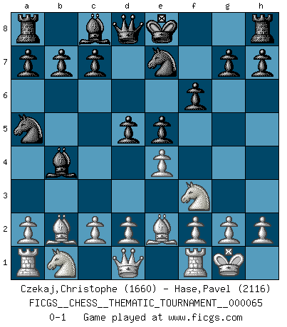 Last move : 0-1 2008 December 28 16:24:54 [Event "FICGS__CHESS__THEMATIC_TOURNAMENT__000065"] [Site "FICGS"] [Date "2008.11.08"] [Round "1"] [White "Czekaj,Christophe"] [Black "Hase,Pavel"] [Result "0-1"] [WhiteElo "1660"] [BlackElo "2116"] 1.b4 e5 2.Bb2 f6 3.e4 Bxb4 4.Bc4 Nc6 5.Nf3 Nge7 6.O-O Na5 7.Be2 d5 0-1 This chess game has been lost on time (started : 2008.11.08 14:24:56) Polish (Sokolsky) opening Kingside Castling by player White (move 6) Player Black won this chess game. Follow this game move after move (download)The enormous mental resilience, without which no Chess player can exist, was so much taken up by Chess that he could never free his mind of this game. (Albert Einstein) Ein Gewinn durch eine ungenaue Kombination, sei sie auch noch so vorzeigbar, erfüllt mich mit Schaudern. (Wilhelm Steinitz) El jugador blanco perdió porque fallo en recordar la coreccta continuación y tuvo que pensar por sí mismo las movidas. (Siegbert Tarrasch) Celui qui prend des risques peut perdre, celui qui n'en prend pas perd toujours. (Xavier Tartacover) The beginning of wisdom is silence. The second step is listening. (Unknown)