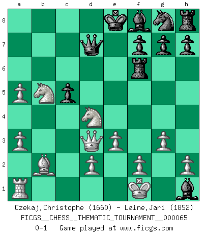 Last move : 0-1 2009 April 16 15:22:5 [Event "FICGS__CHESS__THEMATIC_TOURNAMENT__000065"] [Site "FICGS"] [Date "2008.11.08"] [Round "1"] [White "Czekaj,Christophe"] [Black "Laine,Jari"] [Result "0-1"] [WhiteElo "1660"] [BlackElo "1852"] 1.b4 e5 2.Bb2 e4 3.a3 Nc6 4.e3 d5 5.c4 dxc4 6.Bxc4 Qg5 7.g3 Qf5 8.Ne2 b5 9.Bb3 a5 10.Qc2 Bb7 11.bxa5 Ra6 12.Nbc3 Ne5 13.Nd4 Qd7 14.Ncxb5 Nd3+ 15.Kf1 c5 16.Bc4 Rf6 17.Bxd3 exd3 18.Qxd3 Bxh1 0-1 Polish (Sokolsky) opening Player Black won this chess game. Follow this game move after move (download)I play correspondence chess because it is both art and science while chess is art only. (A player at FICGS) Alle offensichtlichen Züge sehen nach dem Spiel in der Analyse verdächtig aus. (Viktor Kortschnoi) Combinaciones deslumbrantes son para la mayoría, mover madera es para los pocos. (Georg Kieninger) Ce qui est bien, c'est d'avoir tout un tas de pièces en prise : l'adversaire ne peut en prendre qu'une à la fois. Cité par Thierry Audin. They misunderestimated me. (George W. Bush, Bentonville nov. 6, 2000)