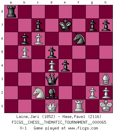 Last move : 0-1 2009 April 28 16:7:17 [Event "FICGS__CHESS__THEMATIC_TOURNAMENT__000065"] [Site "FICGS"] [Date "2008.11.08"] [Round "1"] [White "Laine,Jari"] [Black "Hase,Pavel"] [Result "0-1"] [WhiteElo "1852"] [BlackElo "2116"] 1.b4 e5 2.Bb2 f6 3.b5 a6 4.a4 d5 5.e3 Be6 6.Nf3 axb5 7.axb5 Rxa1 8.Bxa1 Nd7 9.d4 Qa8 10.Bc3 e4 11.Nfd2 Nb6 12.Nb3 Bd6 13.Nc5 Kf7 14.Nxe6 Kxe6 15.Be2 f5 16.O-O Nf6 17.Nd2 Qa3 18.Ba1 Ra8 19.c4 Bb4 20.c5 Na4 21.Nb3 Qa2 22.c6 b6 23.f3 Nb2 24.Bxb2 Qxb2 25.fxe4 fxe4 26.Bg4+ Ke7 27.Bh3 Qc3 28.Kh1 Qxe3 29.Na1 Qd3 30.Nc2 Bd2 0-1 Polish (Sokolsky) opening Kingside Castling by player White (move 16) Player Black won this chess game. Follow this game move after move (download)There are tough players and nice guys, and I'm a tough player. (Bobby Fischer) Wer der Ansicht ist, daß alle Schachspieler verrückt sind, wird durch Studium des Lebens von Emil Josef Diemer nicht auf andere Gedanken kommen. (Hans Ree) La mitad de las variaciones que son calculadas en una partida de torneo, resultan ser completamente superfluas. Desafortunadamente, nadie sabe por adelantado cual mitad. (Jan Tinman) J'ai toujours senti une vague pitié pour l'homme qui ne connaît rien aux échecs, tout comme j'en aurais pour un homme ignorant de l'amour. Les Echecs, comme la musique ou comme l'amour, ont le pouvoir de rendre heureux. (Siegbert Tarrasch) Life is like a game of cards: the hand you are dealt represents determinism; the way you play it is free will. (Jawaharlal Nehru)