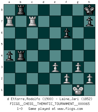 Last move : 1-0 2009 April 25 16:52:28 [Event "FICGS__CHESS__THEMATIC_TOURNAMENT__000065"] [Site "FICGS"] [Date "2008.11.08"] [Round "1"] [White "d Ettorre,Rodolfo"] [Black "Laine,Jari"] [Result "1-0"] [WhiteElo "1900"] [BlackElo "1852"] 1.b4 e5 2.Bb2 Bxb4 3.Bxe5 Nf6 4.c4 O-O 5.e3 d5 6.Nf3 Nc6 7.Bb2 Re8 8.cxd5 Qxd5 9.Bxf6 gxf6 10.Be2 Bf5 11.a3 Ba5 12.O-O Bd3 13.Nc3 Bxc3 14.dxc3 Rad8 15.Bxd3 Qxd3 16.Nd4 Qxc3 17.Qg4+ Kh8 18.Rfc1 Qb2 19.Rab1 Qxa3 20.Nxc6 bxc6 21.Rxc6 Qe7 22.Rbc1 Qe4 23.Qxe4 Rxe4 24.Rxc7 a5 25.Rxf7 a4 26.Ra7 Rb4 27.g3 Rdb8 28.R1c7 1-0 Polish (Sokolsky) opening Kingside Castling by player Black (move 4) Kingside Castling by player White (move 12) Player White won this chess game. Follow this game move after move (download)I feel as if I were a piece in a game of Chess, when my opponent says of it: That piece cannot be moved. (Soren Kierkegaard) Je mehr ich von der FIDE weiss, um so weniger verstehe ich. (Alexander Kalifman) Mi estilo es algo parecido entre un poco de Tal y Petrosian. (Reshevsky) Les échecs sont un jeu par leur forme, un art par leur essence et une science par sa difficulté d'acquisition. Ils peuvent vous procurer autant de plaisir qu'un bon livre ou une belle musique, mais vous n'aurez une réelle joie que si vous arrivez à bien jouer. (Tigran Petrosian) A married woman is like a fish riding a bicycle. (Rodolfo d'Ettorre)