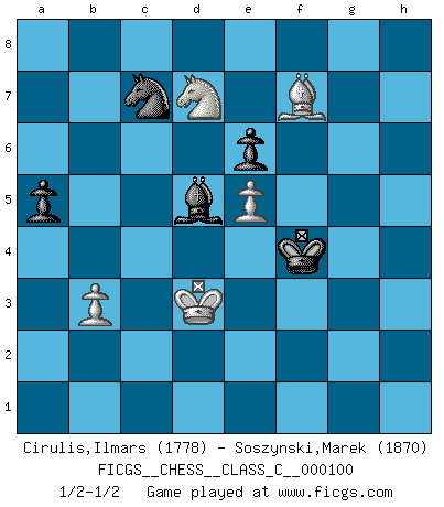 Last move : 1/2-1/2 2009 February 22 0:26:46 [Event "FICGS__CHESS__CLASS_C__000100"] [Site "FICGS"] [Date "2008.11.09"] [Round "1"] [White "Cirulis,Ilmars"] [Black "Soszynski,Marek"] [Result "1/2-1/2"] [WhiteElo "1778"] [BlackElo "1870"] 1.d4 c6 2.e4 d5 3.exd5 cxd5 4.Nf3 g6 5.Bd3 Bg7 6.O-O Nf6 7.Bf4 O-O 8.c3 Nc6 9.Nbd2 Nh5 10.Be3 Qc7 11.Re1 Rb8 12.Nb3 Nf4 13.Bf1 Nh5 14.Qd2 b6 15.h3 Bd7 16.g4 f5 17.gxh5 f4 18.hxg6 hxg6 19.Ng5 Bh6 20.Bxf4 Qxf4 21.Qxf4 Rxf4 22.Ne6 Rf6 23.Nc7 e6 24.Bb5 Kf7 25.Na6 Rh8 26.Rad1 Ke7 27.Rd3 Bf4 28.a4 g5 29.Kf1 Rfh6 30.Nc1 Bd6 31.Ke2 Be8 32.Kd1 Rxh3 33.Rxh3 Rxh3 34.Ne2 Rh2 35.Rg1 Rxf2 36.Rxg5 Rh2 37.Ke1 Kf7 38.b3 Rh7 39.Bd3 Rh1+ 40.Rg1 Rxg1+ 41.Nxg1 Ke7 42.Ne2 Na5 43.Bc2 Bh5 44.Kd2 Kf6 45.Ke3 Kg5 46.Kd2 Bg4 47.Ke3 Bf5 48.Kd2 Kg4 49.Bd1 Bf8 50.Nc1 Kg3 51.Nd3 Bh6+ 52.Ke2 Nb7 53.Nab4 Nd6 54.Ne5 Ne4 55.c4 Bf4 56.cxd5 Nc3+ 57.Ke1 Bxe5 58.dxe5 Nxd5 59.Nc6 a5 60.Kd2 Kf4 61.Bc2 Bh3 62.Bg6 Bg2 63.Kd3 Nc7 64.Nb8 Bd5 65.Nd7 b5 66.axb5 Nxb5 67.Bf7 Nc7 1/2-1/2 Queen's pawn Kingside Castling by player White (move 6) Kingside Castling by player Black (move 7) 10 pieces endgame at move 66 : White KBNPP , Black KBNPP WHITE : King + 1 Bishop 1 Knight 2 Pawns BLACK : King + 1 Bishop 1 Knight 2 Pawns This chess game ended in a draw. Follow this game move after move (download)You sit at the board and suddenly your heart leaps. Your hand trembles to pick up the piece and move it. But what Chess teaches you is that you must sit there calmly and think about whether it's really a good idea and whether there are other better ideas. (Stanley Kubrick) Taktik ist was man tun muß, wenn etwas zu tun ist. Strategie ist was man tun muß, wenn nichts zu tun ist. (Savielly Grigorievitsch Tartakower) El ganador de una partida es aquel jugador que hace el penúltimo error. (Savielly Tartakover) Les Echecs, c'est l'art de la guerre sans les charniers, c'est la résurrection des morts tombés au champ d'honneur, l'espoir perpétuel, la suprématie de l'intelligence sur la force, la culture de l'esprit. (F. Szpiner) There's no money in correspondence chess. (John Knudsen)