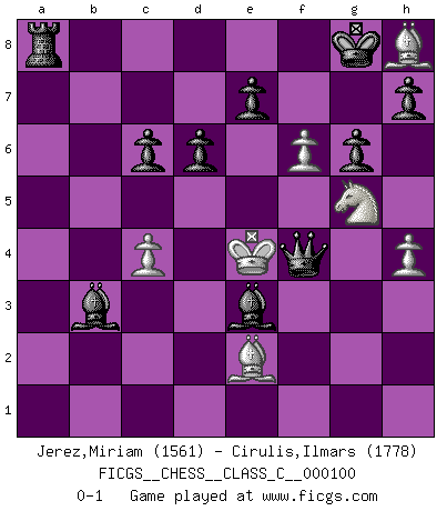 Last move : 0-1 2009 June 5 3:34:15 [Event "FICGS__CHESS__CLASS_C__000100"] [Site "FICGS"] [Date "2008.11.09"] [Round "1"] [White "Jerez,Miriam"] [Black "Cirulis,Ilmars"] [Result "0-1"] [WhiteElo "1561"] [BlackElo "1778"] 1.e4 c5 2.c4 Nc6 3.Nc3 d6 4.Nf3 g6 5.d4 cxd4 6.Nxd4 Nf6 7.Be2 Bg7 8.Nxc6 bxc6 9.b3 Nxe4 10.Nxe4 Bxa1 11.Bh6 Be5 12.O-O Bf5 13.Nd2 f6 14.f4 Qb6+ 15.Rf2 Bd4 16.Nf3 Bxf2+ 17.Kf1 Qe3 18.Qd2 Qxd2 19.Nxd2 Be3 20.Nf3 Kf7 21.g3 a5 22.a4 Bc2 23.h4 Bxb3 24.Kg2 Bxa4 25.g4 Bb3 26.Kg3 a4 27.g5 a3 28.gxf6 a2 29.Bg7 a1Q 30.Ng5+ Kg8 31.Bxh8 Qg1+ 32.Kf3 Qf2+ 33.Ke4 Qxf4+ 0-1 Sicilian defense Kingside Castling by player White (move 12) Promotion Queen by player Black (move 29) Player Black won this chess game. Follow this game move after move (download)It is always better to sacrifice your opponent's men. (Savielly Tartakower) Ich habe die besten Aussichten, den ersten Preis zu gewinnen - denn jeder muss gegen Steinitz spielen, nur ich nicht! (Wilhelm Steinitz) El estómago es una parte esencial del maestro de Ajedrez. (Bent Larsen) On n'a jamais que l'âge auquel on a commence à jouer aux échecs car après on cesse de vieillir. (Capablanca) The Internet is so big, so powerful and pointless that for some people it is a complete substitute for life. (Andrew Brown)