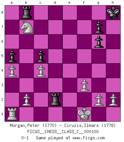 Last move : 0-1 2009 March 25 15:15:57 [Event "FICGS__CHESS__CLASS_C__000100"] [Site "FICGS"] [Date "2008.11.09"] [Round "1"] [White "Morgan,Peter"] [Black "Cirulis,Ilmars"] [Result "0-1"] [WhiteElo "1770"] [BlackElo "1778"] 1.c4 e5 2.Nc3 f5 3.e4 d6 4.Bd3 fxe4 5.Nxe4 Be7 6.Nf3 Nf6 7.O-O O-O 8.Nxf6+ Bxf6 9.Be4 Na6 10.d4 exd4 11.Nxd4 Nc5 12.Bc2 a5 13.Re1 Qd7 14.Nb3 Ne6 15.a4 Qf7 16.Qe2 Bd4 17.Be3 Bxe3 18.Qxe3 Nf4 19.Nd4 Bd7 20.Be4 Rae8 21.Qc3 Bh3 22.Bf3 c5 23.Nb5 Ne2+ 24.Rxe2 Rxe2 25.Nxd6 Qg6 26.Bd5+ Kh8 27.Qg3 Be6 28.Qxg6 hxg6 29.Bxe6 Rxe6 30.Nxb7 Re2 31.f3 Rb8 32.Kf1 Rd2 0-1 English Opening Kingside Castling by player White (move 7) Kingside Castling by player Black (move 7) Player Black won this chess game. Follow this game move after move (download)The passed pawn is a criminal, who should be kept under lock and key. Mild measures, such as police surveillance, are not sufficient. (Nimzovitch) Es ist peinlich, dass ich nie Weltmeister wurde. Es wäre leicht, Leonid Breschnjew als Ursache vorzuschieben, dessen Apparat den Vorzeigekommunisten Anatoli Karpow in allem unterstützte. Aber Garri Kasparow zum Beispiel, der ebenfalls von den Sowjets unerwünscht war, hat trotz der Widerstände den WM-Titel erobert. (Viktor Kortschnoi) El Ajedrez es imaginación. (David Bronstein) La victoire dans une partie d'Echecs appartient la plupart du temps à celui qui voit un peu plus loin que l'adversaire. (Lasker) There's always a bigger fish. (Qui-Gon Jinn in Star Wars ep.1)