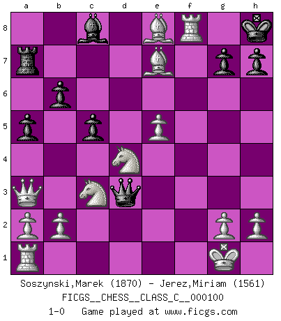 Last move : 1-0 2009 January 24 9:16:31 [Event "FICGS__CHESS__CLASS_C__000100"] [Site "FICGS"] [Date "2008.11.09"] [Round "1"] [White "Soszynski,Marek"] [Black "Jerez,Miriam"] [Result "1-0"] [WhiteElo "1870"] [BlackElo "1561"] 1.e4 e5 2.d4 d5 3.dxe5 Nc6 4.exd5 Nxe5 5.Qe2 Bd6 6.f4 Ne7 7.fxe5 Bc5 8.Qb5+ Qd7 9.Qxc5 b6 10.Qa3 Qxd5 11.Nf3 Qe4+ 12.Be2 Qxc2 13.Nc3 a5 14.Bg5 O-O 15.Bxe7 Re8 16.O-O c6 17.Bc4 Ra7 18.Nd4 c5 19.Bxf7+ Kh8 20.Bxe8 Qd3 21.Rf8+ 1-0 King's pawn game Kingside Castling by player Black (move 14) Kingside Castling by player White (move 16) Player White won this chess game. Follow this game move after move (download)A win by an unsound combination, however showy, fills me with artistic horror. (Wilhelm Steinitz) Wenn Dein Gegner dir ein Remis anbietet, versuch herauszufinden, weshalb er glaubt schlechter zu stehen. (Nigel Short) El Ajedrez es tan inspirador que yo no creo que un buen jugador sea capaz de tener un pensamiento malo durante una partida. (Wilhelm Steinitz) Le joueur d'Echecs qui veut atteindre le top est obligé de développer son propre credo créatif. Alexeï Stepanovicth Souétine. Il est facile d'écrire des livres ! Ce qui est difficile, c'est de jouer ! (Alexeï Stepanovicth Souétine) The meaning of life is that it is to be lived, and it is not to be traded and conceptualized and squeezed into a pattern of systems. (Bruce Lee)