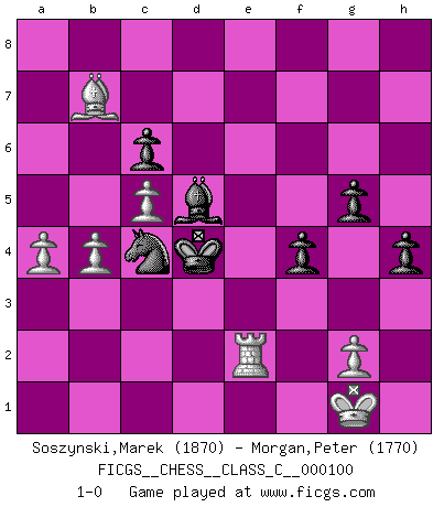 Last move : 1-0 2009 May 3 15:49:34 [Event "FICGS__CHESS__CLASS_C__000100"] [Site "FICGS"] [Date "2008.11.09"] [Round "1"] [White "Soszynski,Marek"] [Black "Morgan,Peter"] [Result "1-0"] [WhiteElo "1870"] [BlackElo "1770"] 1.e4 e5 2.d4 exd4 3.Qxd4 Nc6 4.Qe3 Nf6 5.Bd2 Ng4 6.Qg3 Nd4 7.Qc3 Ne6 8.Be2 Nf6 9.e5 Ne4 10.Qe3 Nxd2 11.Nxd2 Bc5 12.Qg3 d5 13.Ngf3 f5 14.h4 f4 15.Qh2 O-O 16.Nb3 Bb6 17.O-O a5 18.Rad1 a4 19.Nc1 c6 20.c4 d4 21.Bd3 Qe7 22.Be2 Qb4 23.Rd2 Bd7 24.Rfd1 Be8 25.Nd3 Qe7 26.h5 Ba5 27.Rc2 Rf5 28.Qh4 Qxh4 29.Nxh4 Rg5 30.h6 gxh6 31.c5 Bc7 32.Rc4 Bxe5 33.Nf3 Bf6 34.Nxg5 hxg5 35.Bg4 Nc7 36.Rb4 Nb5 37.a3 h5 38.Be6+ Kg7 39.Bc4 Kh6 40.f3 Ra5 41.Re1 Bg6 42.Nf2 Kg7 43.Kf1 h4 44.Ng4 Bf7 45.Bd3 Bd8 46.Re5 Ra6 47.Re4 Bf6 48.Nxf6 Kxf6 49.Rexd4 Nxd4 50.Bxa6 Nxf3 51.Bxb7 Bc4+ 52.Kf2 Ne5 53.Rxa4 Bd5 54.Rd4 Ng4+ 55.Kg1 Ke5 56.Rd2 Ne3 57.a4 Nc4 58.Re2+ Kd4 59.b4 1-0 Centre game : Berger variation Kingside Castling by player Black (move 15) Kingside Castling by player White (move 17) Player White won this chess game. Follow this game move after move (download)I won't play with you anymore. You have insulted my friend. - When an opponent cursed himself for a blunder. (Miguel Najdorf) Ich organisiere ein großes Turnier, was mich etwa 120000 Dollar kostet. Ich denke, das ist das erste Mal in der Schachgeschichte, daß ein Schachgroßmeister auch als Mäzen auftritt. (Miguel Najdorf) EL Ajedrez es como la vida. (Boris Spassky) Même si vous avez un bon coup à faire, regardez toujours s'il n'y en a pas un qui lui soit préférable. (Pedro Damiano) Question: Is 'This statement is paradoxical' a paradoxical statement ? Or is it a meta-paradox ? (Normajean Yates)