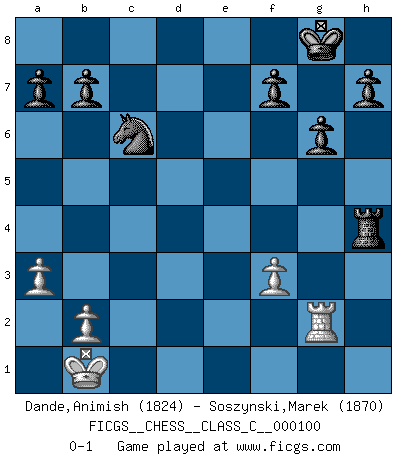 Last move : 0-1 2009 January 27 16:41:4 [Event "FICGS__CHESS__CLASS_C__000100"] [Site "FICGS"] [Date "2008.11.09"] [Round "1"] [White "Dande,Animish"] [Black "Soszynski,Marek"] [Result "0-1"] [WhiteElo "1824"] [BlackElo "1870"] 1.e4 c6 2.d4 d5 3.exd5 cxd5 4.c4 g6 5.Nf3 Nf6 6.Nc3 Bg7 7.Be3 O-O 8.Qd2 Nc6 9.O-O-O dxc4 10.Bxc4 Bf5 11.Bd3 Bxd3 12.Qxd3 Rc8 13.Kb1 Nd5 14.Nxd5 Qxd5 15.a3 Rfd8 16.h4 e5 17.Bg5 e4 18.Qe3 exf3 19.Bxd8 fxg2 20.Rhg1 Rxd8 21.f3 Bxd4 22.Rxd4 Qxd4 23.Qxd4 Rxd4 24.Rxg2 Rxh4 0-1 Caro-Kann : Panov-Botvinnik attack Kingside Castling by player Black (move 7) Queenside Castling by player White (move 9) Player Black won this chess game. Follow this game move after move (download)Chess is a terrific way for kids to build self image and self esteem. (Saudin Robovic) Ich verstehe Aljechins Kombinationen ganz gut; aber woher er diese Angriffschancen bekommt und wie er die Eröffnung behandelt das ist für mich ein Buch mit sieben Siegeln. (Rudolf Spielmann) El jugador blanco perdió porque fallo en recordar la coreccta continuación y tuvo que pensar por sí mismo las movidas. (Siegbert Tarrasch) Il n'y a pas eu de défaite parce que je ne crois pas que cet ordinateur ait jamais existé. IBM a triché en refusant d'imprimer les modes de recherche de la machine. C'est évident, pendant le match, des coups décisifs ont été joués par des êtres humains. Aujourd'hui, les meilleurs spécialistes en informatique ne peuvent toujours pas expliquer comment Deep-Blue a pu jouer contre la logique des ordinateurs. IBM a gagné une guerre de communication, mais ils sont incapables de prouver que l'ordinateur a gagné tout seul. (Garry Kasparov) At last I discovered the true beauty of chess. So I proposed to her. (Dinesh De Silva)