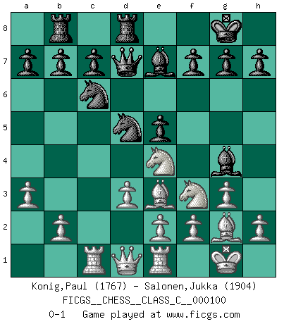 Last move : 0-1 2009 February 9 8:52:0 [Event "FICGS__CHESS__CLASS_C__000100"] [Site "FICGS"] [Date "2008.11.09"] [Round "1"] [White "Konig,Paul"] [Black "Salonen,Jukka"] [Result "0-1"] [WhiteElo "1767"] [BlackElo "1904"] 1.c4 e5 2.Nc3 Nf6 3.Nf3 Nc6 4.g3 d5 5.cxd5 Nxd5 6.Bg2 Nb6 7.O-O Be7 8.d3 O-O 9.Be3 Bg4 10.Rc1 Rb8 11.a3 Qd7 12.Re1 Rfd8 13.Ne4 Nd5 0-1 This chess game has been lost on time (started : 2008.11.09 18:44:54) English Opening Kingside Castling by player White (move 7) Kingside Castling by player Black (move 8) Player Black won this chess game. Follow this game move after move (download)Chess, like love, is infectious at any age. (Flohr) Frage: Was machen Sie mit den Preisen? Anwort: Ich habe Angst, dass meine Freundin davon neue Kleider kauft. (Loek van Wely) Jugadores de primera clase pierden en contra de jugadores de segunda clase porque los jugadores de segunda clase a veces juegan una partida de primer clase. (Siegbert Tarrasch) 'L'échange des dames est un coup dur pour les deux adversaires...' Un journaliste lors d'une partie du match Spassky-Fischer Indecision is the key to flexibility. (Unknown)