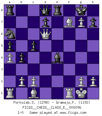 Last move : 1-0 2009 January 5 17:51:40 [Event "FICGS__CHESS__CLASS_E__000096"] [Site "FICGS"] [Date "2008.11.10"] [Round "1"] [White "Porkolab,Sandor"] [Black "Gramajo,Francisco"] [Result "1-0"] [WhiteElo "1298"] [BlackElo "1192"] 1.e4 e5 2.Nc3 Bb4 3.Nd5 Bd6 4.Nf3 Nf6 5.Bc4 O-O 6.d3 Nxd5 7.Bxd5 c6 8.Bb3 b5 9.a4 b4 10.O-O a5 11.d4 exd4 12.Nxd4 Be5 13.f4 Bxd4+ 14.Qxd4 Na6 15.f5 c5 16.Qd6 Bb7 17.f6 Bxe4 18.fxg7 Re8 19.Bxf7+ 1-0 Vienna game Kingside Castling by player Black (move 5) Kingside Castling by player White (move 10) Player White won this chess game. Follow this game move after move (download)I'd rather have a Pawn than a finger. (Reuben Fine) Das Schach ist nichts für kleine Geister, es beansprucht einen vollen Mann, der sich nicht sklavisch an das Überlieferte hält, sondern selbständig die Tiefen des Spiels zu ergründen sucht. (Wilhelm Steinitz) El Ajedrez es un juego terrible. Si no dominas el centro, tu oponente tiene una posición mas libre. Si tu tienes el centro, entonces realmente tienes algo de que preocuparte. (Siegbert Tarrasch) Je menace de comprendre la position. (Anonyme) In every real man a child is hidden that wants to play. (Friedrich Nietzsche)