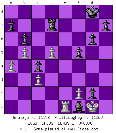 Last move : 0-1 2008 December 1 20:0:27 [Event "FICGS__CHESS__CLASS_E__000096"] [Site "FICGS"] [Date "2008.11.10"] [Round "1"] [White "Gramajo,Francisco"] [Black "Willoughby,Peter"] [Result "0-1"] [WhiteElo "1192"] [BlackElo "1269"] 1.Nf3 g6 2.d4 Nf6 3.Bg5 Bg7 4.Bxf6 Bxf6 5.h4 c5 6.c3 Qa5 7.e3 Nc6 8.Nbd2 O-O 9.Nc4 Qd8 10.a3 b6 11.Bd3 d5 12.Ncd2 Bg4 13.Qa4 Na5 14.dxc5 e5 15.b4 Nc4 16.Bxc4 dxc4 17.O-O Bxh4 18.Nxh4 Qxh4 19.c6 f5 20.b5 Be2 21.Rfe1 Bd3 22.Nf3 Qf6 23.Qa6 e4 24.a4 exf3 25.c7 fxg2 26.Rad1 Bf1 27.Rd8 Rfxd8 28.cxd8Q+ Qxd8 29.Qb7 Rc8 30.e4 Rc7 31.Qd5+ Qxd5 32.exd5 Rd7 0-1 Reti Opening Kingside Castling by player Black (move 8) Kingside Castling by player White (move 17) Promotion Queen by player White (move 28) Player Black won this chess game. Follow this game move after move (download)Not all artists are Chess players, but all Chess players are artists. (Marcel Duchamp) Ich glaube nicht an Psychologie, ich glaube an gute Züge. (Robert James Fischer) No existe un remordimiento como el remordimiento del Ajedrez. (H. G. Wells) Aucun coup ne doit être joué sans but. (Pedro Damiano) An expert is a man who has made all the mistakes which can be made in a very narrow field. (Niels Bohr)