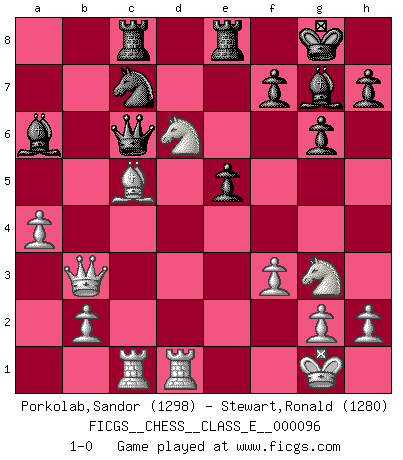 Last move : 1-0 2009 March 12 12:40:33 [Event "FICGS__CHESS__CLASS_E__000096"] [Site "FICGS"] [Date "2008.11.10"] [Round "1"] [White "Porkolab,Sandor"] [Black "Stewart,Ronald"] [Result "1-0"] [WhiteElo "1298"] [BlackElo "1280"] 1.d4 Nf6 2.c4 g6 3.Nc3 Bg7 4.e4 d6 5.f3 O-O 6.Be3 c6 7.Bd3 a6 8.Nge2 Nbd7 9.Qd2 b5 10.O-O e5 11.d5 Rb8 12.dxc6 Nc5 13.cxb5 Nxd3 14.Qxd3 axb5 15.Nxb5 Ba6 16.a4 Rc8 17.Rac1 d5 18.exd5 Nxd5 19.Bc5 Nc7 20.Qb3 Re8 21.Rfd1 Qf6 22.Ng3 Qxc6 23.Nd6 1-0 King's Indian : Saemisch, Byrne variation Kingside Castling by player Black (move 5) Kingside Castling by player White (move 10) Player White won this chess game. Follow this game move after move (download)Don't even mention losing to me. I can't stand to think of it. (Bobby Fischer) Ich glaube, ich kenne inzwischen die Gründe für mein Versagen: schachliche Charakterfehler. Ich war nie ein Wunderkind und in meiner gesamten menschlichen Entwicklung immer zu langsam. (Viktor Kortschnoi) Yo no le temo a Spassky. Todos saben que yo soy el mejor. Uno no necesita un torneo para probarlo. (Bobby Fischer) Seul un grand joueur sait à quel point il joue faiblement. (Xavier Tartacover) We need strong personalities and only one world champion to attract sponsors. (Anatoly Karpov)