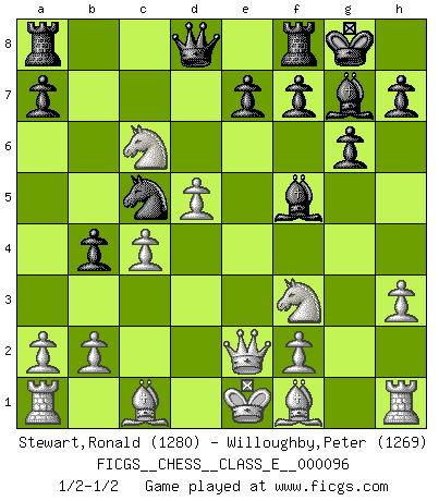Last move : 1/2-1/2 2008 December 22 9:58:31 [Event "FICGS__CHESS__CLASS_E__000096"] [Site "FICGS"] [Date "2008.11.10"] [Round "1"] [White "Stewart,Ronald"] [Black "Willoughby,Peter"] [Result "1/2-1/2"] [WhiteElo "1280"] [BlackElo "1269"] 1.d4 Nf6 2.c4 c5 3.d5 b5 4.Nf3 b4 5.Nbd2 g6 6.e4 Bg7 7.e5 Ng4 8.Qe2 O-O 9.h3 Nh6 10.Ne4 Nf5 11.Nxc5 Na6 12.Nd3 d6 13.g4 dxe5 14.gxf5 Bxf5 15.Ndxe5 Nc5 16.Nc6 1/2-1/2 Benko gambit Kingside Castling by player Black (move 8) This chess game ended in a draw. Follow this game move after move (download)I played Chess with him and would have beaten him sometimes only he always took back his last move, and ran the game out differently. (Mark Twain) Das Schachspiel übertrifft alle anderen Spiele so weit wie der Chimborasso einen Misthaufen. (Arthur Schopenhauer) Tu sabes que vas a perder. Aún cuando tenía la ventaja, yo sabía que iba a perder. - al estar jugando con Fischer (Andrew Soltis) Ne tendez aucun piège pour le plaisir ! Ne jouez rien dans l'espoir que l'adversaire réagisse de façon stupide ! Prenez toujours pour acquis que l'adversaire va trouver le meilleur coup ! Ne jouez jamais de coup dans l'espoir que l'adversaire ne voie pas la menace ! Chacun de vos coups doit améliorer la position d'une façon ou d'une autre. Unless I accept my faults I will most certainly doubt my virtues. (Hugh Prather)