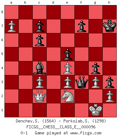 Last move : 0-1 2009 May 26 12:26:6 [Event "FICGS__CHESS__CLASS_E__000096"] [Site "FICGS"] [Date "2008.11.10"] [Round "1"] [White "Denchev,Stanimir"] [Black "Porkolab,Sandor"] [Result "0-1"] [WhiteElo "1564"] [BlackElo "1298"] 1.c3 d5 2.d3 e5 3.Qc2 Nf6 4.e4 Bc5 5.Bg5 O-O 6.Be2 h6 7.Bxf6 Qxf6 8.Nf3 dxe4 9.dxe4 Qg6 10.O-O Bh3 11.Ne1 Nc6 12.Nd2 Rad8 13.Ndf3 a6 14.b4 Be7 15.b5 axb5 16.Bxb5 Bf6 17.Bxc6 bxc6 18.Kh1 Be6 19.Nd2 Qh5 20.Nef3 Rd6 21.a4 g5 22.a5 g4 23.Ng1 Qg5 24.Rfd1 Ra8 25.Ne2 Be7 26.Nf1 Rxd1 27.Qxd1 Bc5 28.Kg1 Rd8 29.Qc2 h5 30.a6 Bc4 31.Rd1 Rxd1 32.Qxd1 h4 33.Qc2 Kh7 34.g3 Qf6 35.Ne3 Bxe3 36.fxe3 Qf3 37.a7 h3 0-1 Saragossa Opening Kingside Castling by player Black (move 5) Kingside Castling by player White (move 10) Player Black won this chess game. Follow this game move after move (download)In Fischer's hands, a slight theoretical advantage is as good a being a Queen ahead. (Isaac Kashdan) Kasparov stellt für gewöhnlich die Regeln auf und bricht sie dann selbst wieder. (Alexej Shirov) Prefiero perder una partida realmente buena, que ganar una mala. (David Levy) Ce qui est bien, c'est d'avoir tout un tas de pièces en prise : l'adversaire ne peut en prendre qu'une à la fois. Cité par Thierry Audin. Humor is by far the most significant activity of the human brain. (Edward De Bono)