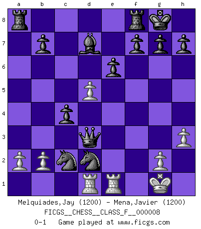Last move : 0-1 2006 September 21 19:50:38 [Event "FICGS__CHESS__CLASS_F__000008"] [Site "FICGS"] [Date "2006.08.18"] [Round "1"] [White "Melquiades,Jay"] [Black "Mena,Javier"] [Result "0-1"] [WhiteElo "1200"] [BlackElo "1200"] 1.e4 c5 2.c3 d6 3.h3 Nf6 4.Qa4+ Nc6 5.Bb5 Bd7 6.d4 e6 7.f3 Be7 8.Ne2 O-O 9.Na3 a6 10.Nc4 axb5 11.Qc2 bxc4 12.Bd2 d5 13.O-O dxe4 14.fxe4 cxd4 15.cxd4 Qb6 16.Be3 Nb4 17.Qc3 Nxe4 18.d5 Bc5 19.Bxc5 Qxc5+ 20.Qd4 Qxd4+ 21.Kh2 Qe5+ 22.Kg1 Nd2 23.Rfd1 Qxe2 24.Re1 Qd3 25.Rad1 Nc2 0-1 Sicilian : Alapin's variation (2.c3) Kingside Castling by player Black (move 8) Kingside Castling by player White (move 13) Player Black won this chess game. Follow this game move after move (download)It was clear to me that the vulnerable point of the American Grandmaster (Bobby Fischer) was in double-edged, hanging, irrational positions, where he often failed to find a win even in a won position. (Efim Geller) Wenn du auf das Glück wartest, wird das Leben ziemlich langweilig. (Mikhail Nekhemyevich Tal) Mi estilo es algo parecido entre un poco de Tal y Petrosian. (Reshevsky) Il n'y a pas eu de défaite parce que je ne crois pas que cet ordinateur ait jamais existé. IBM a triché en refusant d'imprimer les modes de recherche de la machine. C'est évident, pendant le match, des coups décisifs ont été joués par des êtres humains. Aujourd'hui, les meilleurs spécialistes en informatique ne peuvent toujours pas expliquer comment Deep-Blue a pu jouer contre la logique des ordinateurs. IBM a gagné une guerre de communication, mais ils sont incapables de prouver que l'ordinateur a gagné tout seul. (Garry Kasparov) If you are good, you will be assigned all the work. If you are really good, you will get out of it. (Dan Rotaru)