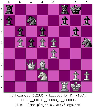 Last move : 1-0 2009 January 4 21:1:0 [Event "FICGS__CHESS__CLASS_E__000096"] [Site "FICGS"] [Date "2008.11.10"] [Round "1"] [White "Porkolab,Sandor"] [Black "Willoughby,Peter"] [Result "1-0"] [WhiteElo "1298"] [BlackElo "1269"] 1.c4 g6 2.Nc3 Bg7 3.d4 Nf6 4.e4 c5 5.d5 d6 6.f4 Qa5 7.Bd2 Qb6 8.Be2 Qxb2 9.Rb1 Qa3 10.Nb5 Qxa2 11.Ra1 Qb2 12.Bc3 Qxa1 13.Qxa1 Na6 14.Bd3 O-O 15.Nf3 Bd7 16.O-O Bxb5 17.cxb5 Nc7 18.Ba5 b6 19.Bc3 Nh5 20.Nd2 Bxc3 21.Qxc3 e5 22.fxe5 1-0 English Opening Kingside Castling by player Black (move 14) Kingside Castling by player White (move 16) Player White won this chess game. Follow this game move after move (download)Chess is thirty to forty percent psychology. You don't have this when you play a computer. I can't confuse it. (Judith Polgar) Ich verstehe Aljechins Kombinationen ganz gut; aber woher er diese Angriffschancen bekommt und wie er die Eröffnung behandelt das ist für mich ein Buch mit sieben Siegeln. (Rudolf Spielmann) No solamente yo pronostico su triunfo sobre Botvinnik, sino que me adelanto y digo que probablemente Fischer es el jugador de Ajedrez mas grande que haya existido. (John Collins) Toute estimation doit être constamment réévaluée. (Jacob Estrin) All the troubles of the world come from being unable to sit alone in a quiet room. (Blaise Pascal)