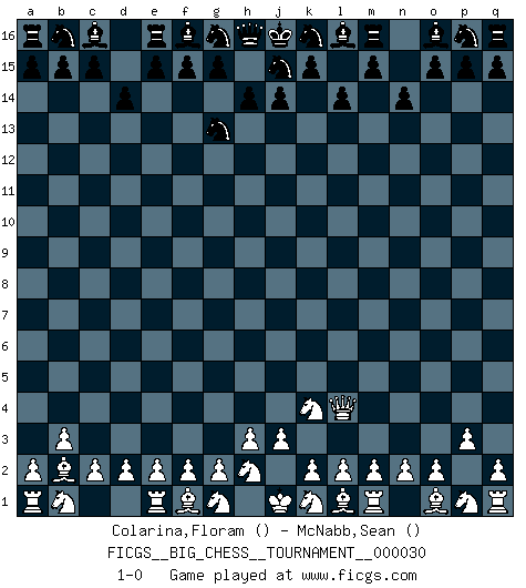 Last move : 1-0 2008 November 17 3:45:41 [Event "FICGS__BIG_CHESS__TOURNAMENT__000030"] [Site "FICGS"] [Date "2008.11.11"] [Round "1"] [White "Colarina,Floram"] [Black "McNabb,Sean"] [Result "1-0"] [WhiteElo ""] [BlackElo ""] 1.j2-k4 h15-g13 2.b2-b3 n15-n14 3.h1-l4 l15-l14 4.c1-b2 d15-d14 5.p2-p3 1-0 Follow this game move after move (download)I had a toothache during the first game. In the second game I had a headache. In the third game it was an attack of rheumatism. In the fourth game, I wasn't feeling well. And in the fifth game? Well, must one have to win every game ? (Siegbert Tarrasch) Ich könnte leicht behaupten: Ja,ja, Leonid Breschnew wollte nicht, daß ich Weltmeister werde. In der Tat war die Sache komplizierter. (Viktor Kortschnoi) Debemos de asegurarnos de que el Ajedrez no se convierta en un lenguaje muerto, muy interesante, pero tan solo para un grupo muy pequeño. (Sytze Faber) Des combinaisons [dans le jeu d'échecs] pareilles à des mélodies. Je crois entendre pour ainsi dire la musique des coups... (Vladimir Nabokov) Always be a first-rate version of yourself, instead of a second-rate version of somebody else. (Judy Garland)
