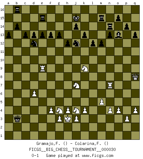 Last move : 0-1 2009 February 8 20:18:32 [Event "FICGS__BIG_CHESS__TOURNAMENT__000030"] [Site "FICGS"] [Date "2008.11.11"] [Round "1"] [White "Gramajo,Francisco"] [Black "Colarina,Floram"] [Result "0-1"] [WhiteElo ""] [BlackElo ""] 1.p1-o3 b16-c14 2.o3-n5 e15-e14 3.n2-n3 g15-g13 4.o2-o4 p15-p14 5.d2-d4 o16-p15 6.e2-e3 b15-b14 7.b1-c3 c16-b15 8.m2-m4 c14-b12 9.h2-g4 m15-m13 10.p2-p3 b15-q1 11.o1-g8 l15-l14 12.m1-q1 h16-b10 13.k1-l3 b10-g10 14.q1-m1 g10-g8 15.g2-g3 g8-e8 16.m1-m2 p15-d4 17.c3-b5 d4-p15 18.h1-d5 d15-d13 19.h3-h4 j15-g14 20.b5-d6 e8-c10 21.e1-e2 l16-o13 22.c2-c3 g16-f14 23.e2-d2 h14-h13 24.f1-j4 c10-d10 25.e3-e4 f16-k12 26.e4-e5 k16-m15 27.g1-h3 f14-g12 28.b2-b3 k12-d6 29.e5-d6 p15-c3 30.c1-b2 c3-b2 31.d2-b2 a15-a13 32.m2-m3 f15-f13 33.l1-m2 d10-g7 34.g4-e5 m15-k14 35.a1-c1 c15-c13 36.f2-f4 p16-o14 37.h3-g5 j16-j15 38.c1-c7 g7-n13 39.j2-k4 h15-f14 40.l3-k5 g14-h12 41.k4-h5 h12-f11 42.m2-g7 n13-q10 43.q2-q4 o14-m15 44.h5-j7 q16-p16 45.m3-l3 q10-p10 46.n3-n4 q15-q13 47.k2-k3 p10-p12 48.j4-h5 p12-n12 49.j1-j2 m15-l13 50.e5-f7 k14-j12 51.k5-l7 f14-h15 52.l7-k9 g12-h10 53.k9-j11 h13-h12 54.j11-g10 h10-f9 55.g7-f8 n12-m12 56.b2-c2 f11-h10 57.m4-m5 b12-c14 58.c2-e2 c14-d12 59.g10-e11 f9-e11 60.e2-e11 l13-k11 61.f8-h10 k11-h10 62.d5-b7 a16-b16 63.n5-l6 m12-b2 64.j2-h3 b2-g7 65.f7-e5 g7-d10 66.c7-e7 h10-f9 67.b7-d9 d10-l3 68.d9-f9 h15-f14 69.f9-p9 m13-m12 70.k3-k4 n15-n13 71.e5-g4 l14-l13 72.j7-k9 k15-k13 73.l6-j7 f14-g12 74.e11-e9 e14-e13 75.g5-j4 l3-l2 76.p9-p13 m16-m15 77.j7-k5 l2-a2 78.p13-o14 p16-n16 79.e7-n7 n16-n14 80.o14-q12 l13-l12 81.h5-m9 g12-h14 82.q12-q8 e16-e15 83.m9-j12 h14-j12 84.k5-j7 a2-b3 0-1 Follow this game move after move (download)Chess is life. (Bobby Fischer) Ich suche im Schach immer etwas Eigenes. Riskantes Spiel im Stile schachlicher Musketiere ist nicht meine Sache, auch wenn es vielen Freunden scharfer Wendungen gefällt. (Anatoly Karpov) Si yo gano un torneo, yo lo gano por mí mismo. Yo hago las jugadas. Nadie me ayuda. (Bobby Fischer) Fischer est le meilleur joueur du monde et Karpov n'est qu'un joueur de bistrot. (Garry Kasparov, agé de 16 ans) For a mechanic, you seem to do an excessive amount of thinking. (C-3PO in Star Wars ep.2)