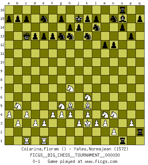 Last move : 0-1 2009 May 2 4:37:36 [Event "FICGS__BIG_CHESS__TOURNAMENT__000030"] [Site "FICGS"] [Date "2008.11.11"] [Round "1"] [White "Colarina,Floram"] [Black "Yates,Normajean"] [Result "0-1"] [WhiteElo ""] [BlackElo "1572"] 1.k2-k4 n15-n13 2.j2-l3 j15-k13 3.g2-g4 m15-m13 4.b2-b3 o15-o14 5.c1-b2 e15-e13 6.p2-p3 h15-g13 7.f2-f4 h16-o10 8.g1-f3 o10-o2 9.p1-o3 d15-d13 10.l3-n4 o2-b14 11.m2-m3 g16-f14 12.h1-l4 o16-m14 13.l1-k2 k16-l14 14.k2-m4 f16-c13 15.m4-c13 b14-c13 16.c2-c4 c16-d15 17.h2-k3 d15-b13 18.l4-m4 m14-g9 19.m4-p7 p15-p14 20.k1-h2 l16-o13 21.l2-l3 b16-c14 22.o1-p2 p16-n15 23.n4-l5 g9-k12 24.p7-p11 j16-j15 25.h3-h4 m16-m15 26.b1-a3 m13-m12 27.d2-d3 f14-h13 28.o3-m4 e16-e14 29.a1-c1 e14-f14 30.e2-e3 f14-f12 31.a3-b5 f12-j12 32.k3-j5 m15-m13 33.q1-o1 n13-n12 34.f3-g5 j12-j11 35.p11-q12 p14-p13 36.q12-o10 q16-o16 37.o10-q8 o16-o15 38.o1-o2 o13-p14 39.m1-o1 m13-o13 40.o2-o13 p14-o13 41.j1-k2 a16-e16 42.q8-q13 o13-p14 43.q13-q5 e16-e14 44.p2-q3 e14-f14 45.h2-j4 f14-f11 46.j5-h7 j11-q11 47.q5-p4 c14-e15 48.j4-k6 f11-p11 49.p4-d15 b13-d15 50.q3-d15 q11-q2 51.l5-n4 f15-f13 52.d15-a12 p11-a11 53.a12-f7 o15-o16 54.a2-a4 k12-l11 55.b2-l11 a11-l11 56.k2-k3 l11-o11 57.f1-k5 p14-o15 58.f7-h5 o11-o1 0-1 This big chess game has been lost on time (started : 2008.11.11 3:52:52) Follow this game move after move (download)Many Chess players were surprised when after the game, Fischer quietly explained: 'I had already analyzed this possibility' in a position which I thought was not possible to foresee from the opening. (Mikhail Tal) Die Idee von Capablanca, Schach als Fach in den Schulen zu lehren, ist großartig. (Fidel Castro) No soy una persona materialista y por eso, no resiento la falta o pérdida del dinero. La ausencia de cosas mundanas carece de importancia. Ya que el Ajedrez es una forma en la que puedo ser tan materialista como yo desee sin tener la necesidad de vender mi alma. (Jamie Walter Adams) Vous n'êtes pas toujours obligé de jouer le meilleur coup. Un coup doit être actif, entreprenant, correct et beau ! (David Bronstein) Creativity is allowing yourself to make mistakes. Art is knowing which ones to keep. (Scott Adams)