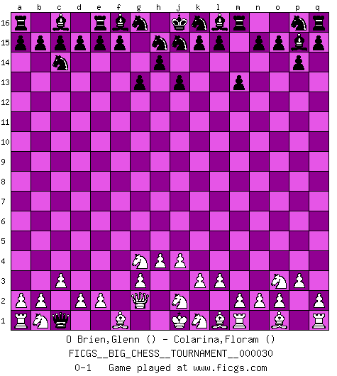 Last move : 0-1 2008 November 28 8:23:29 [Event "FICGS__BIG_CHESS__TOURNAMENT__000030"] [Site "FICGS"] [Date "2008.11.11"] [Round "1"] [White "O Brien,Glenn"] [Black "Colarina,Floram"] [Result "0-1"] [WhiteElo ""] [BlackElo ""] 1.j3-j4 j14-j13 2.h3-h4 p15-p14 3.p2-p3 g15-g13 4.k2-k3 o16-p15 5.c2-c3 h16-f14 6.l2-l3 b16-c14 7.p1-o3 m15-m13 8.g2-g3 f14-f2 9.h2-g4 f2-e1 10.g1-f3 e1-c1 11.f3-e1 c1-e1 12.h1-g2 e1-c1 0-1 Follow this game move after move (download)A strong memory, concentration, imagination, and a strong will is required to become a great Chess player. (Bobby Fischer) Ja, jede Frau in Holland liebt mich bestimmt, und alle Männer hassen mich. (Loek van Wely) Aunque la mayoría de la gente disfruta observar las partidas de los grandes Maestros de ataque, algunos de los jugadores mas notables en la historia han sido los jugadores silenciosos posicionales. Lentamente ellos te aplastan despojandote de tu espacio, congestionando tus piezas y dejandote virtualmente sin nada que hacer. (Yasser Seirawan) Mais n'est-ce pas déjà le limiter injurieusement que d'appeler les échecs un jeu? N'est-ce pas aussi une science, un art, ou quelque chose qui, comme le cercueil de Mahomet entre ciel et terre, est suspendu entre l'un et l'autre, et qui réunit un nombre incroyable de contraires ? (Stefan Zweig) Hello Thibault, if I have had a plan (and I had one, I hope), I have forgotten it during the last week... - Hello Heinz-Georg. What do you mean a plan ? (Anonymous players, during a Big Chess game)