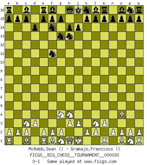 Last move : 0-1 2008 November 17 3:43:40 [Event "FICGS__BIG_CHESS__TOURNAMENT__000030"] [Site "FICGS"] [Date "2008.11.11"] [Round "1"] [White "McNabb,Sean"] [Black "Gramajo,Francisco"] [Result "0-1"] [WhiteElo ""] [BlackElo ""] 1.h2-g4 d15-d14 2.m2-m3 b16-d15 3.l1-o4 h15-g13 4.k1-l3 d15-e13 5.d2-d3 e13-f11 6.b1-c3 j15-h13 7.j2-h4 g16-f14 0-1 Follow this game move after move (download)Life is like a game of Chess, changing with each move. (Chinese proverb) Ich liebe den Moment, wenn ich das Ego meines Gegenüber breche. (Robert James Fischer) Si el ingenio solamente fuese necesario para lucirse, las mujeres serían las mejores jugadoras de Ajedrez del mundo. (Albin) Echiquier : carré parfait, comme la Jérusalem nouvelle décrite par l'auteur de l'Apocalypse, huit cases sur huit, exaltation du chiffre 4, symbole du cosmos aux quatre horizons... où le noir et le blanc, l'ombre et la lumière, le mal et le bien s'entremêlent et se conjuguent. (Robert Couffignal, Le Gambit du poète) He who laughs last probably does not get the joke. (Unknown)