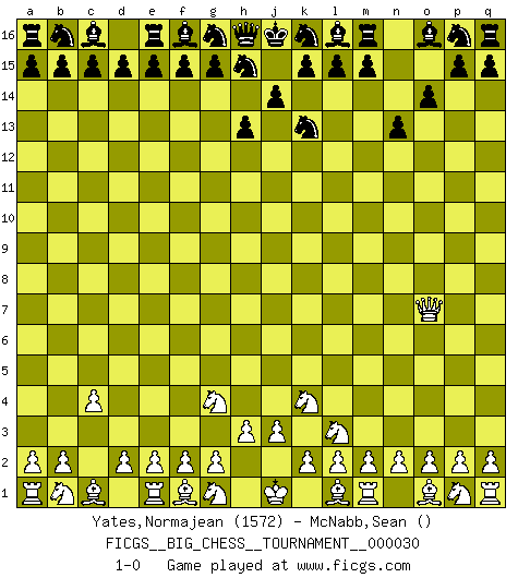 Last move : 1-0 2008 November 18 23:51:53 [Event "FICGS__BIG_CHESS__TOURNAMENT__000030"] [Site "FICGS"] [Date "2008.11.11"] [Round "1"] [White "Yates,Normajean"] [Black "McNabb,Sean"] [Result "1-0"] [WhiteElo "1572"] [BlackElo ""] 1.c2-c4 j15-k13 2.j2-k4 h14-h13 3.h1-o7 o15-o14 4.k1-l3 n15-n13 5.h2-g4 1-0 Follow this game move after move (download)Chess is the art of analysis. (Mikhail Botvinnik) Frage des Reporters: -Worin besteht das Ziel von Gambiteröffnungen? Antwort: -Auf Kosten der Partie einen Ruf als Angriffspieler zu erwerben.- (Siegbert Tarrasch) Prefiero perder una partida realmente buena, que ganar una mala. (David Levy) Pour se monter efficace, un Cavalier a besoin d'avant-postes ! Les Cavaliers font les meilleurs bloqueurs de pions passés. The human is the only animal species whose members are able to talk themselves into difficulties that would not otherwise exist. (Wendell Johnson)