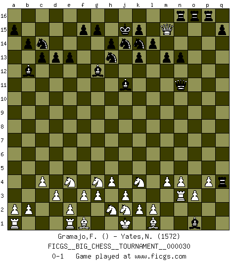 Last move : 0-1 2008 December 2 19:11:2 [Event "FICGS__BIG_CHESS__TOURNAMENT__000030"] [Site "FICGS"] [Date "2008.11.11"] [Round "1"] [White "Gramajo,Francisco"] [Black "Yates,Normajean"] [Result "0-1"] [WhiteElo ""] [BlackElo "1572"] 1.d2-d3 j15-k13 2.n2-n3 g16-f14 3.o1-f9 n15-n13 4.f9-k13 j14-k13 5.j2-k4 h16-o10 6.h1-l4 k16-j14 7.h2-g4 d15-d13 8.o2-o3 m15-m13 9.g2-g3 p16-o14 10.p1-n2 c16-g12 11.l4-b13 b15-b14 12.c1-g5 g12-e10 13.b13-b10 o16-l13 14.b10-c9 e10-n2 15.m1-n1 n2-c12 16.b1-d2 e15-e13 17.h3-h4 l16-p12 18.k1-h2 f16-b12 19.g1-j2 j16-j15 20.d2-e4 c15-c13 21.c2-c4 b16-c14 22.m2-m4 p12-l8 23.f2-f3 e16-e14 24.c9-l9 l8-g12 25.n3-n4 f14-h13 26.q1-o1 e14-f14 27.n1-n3 c12-o1 28.p2-p4 f14-f9 29.l9-p5 f9-q9 30.q2-q4 l13-j11 31.p5-p15 q16-p16 32.g5-n11 o10-n11 33.p15-o14 q9-q4 34.o14-o15 m16-o16 35.o15-m15 l15-l14 36.m15-n14 a16-n16 37.n14-m15 h15-k14 0-1 Follow this game move after move (download)Chess is a fighting game which is purely intellectual and includes chance. (Richard Reti) Alles was ich jemals tun will ist Schach spielen. (Robert James Fischer) Te sientas frente a un tablero y repentinamente tu corazón brinca. Tu mano tiembla al tomar una pieza y moverla. Pero lo que el Ajedrez te enseña es que tu debes permanecer ahí con calma y pensar de que si realmente es una buena idea o de que si hay otras ideas mejores. (Stanley Kubrick) Le système Elo représente seulement une moyenne. Il est simplement un indicateur de votre stabilité. (Anatoli Karpov) The ultimate in disposing one's troops is to be without ascertainable shape. Then the most penetrating spies cannot pry in nor can the wise lay plans against you. (Sun Tzu)