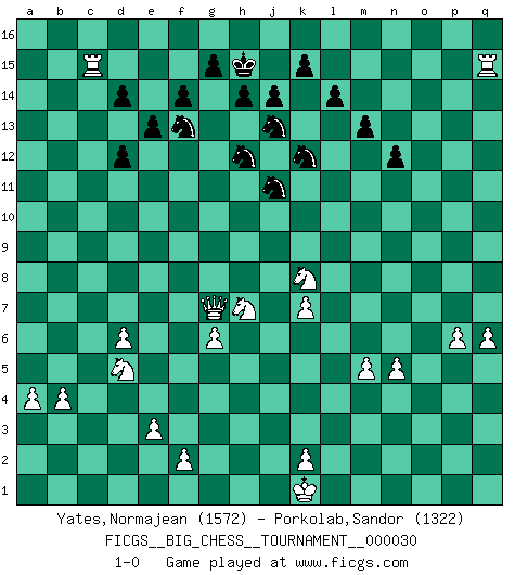 Last move : 1-0 2009 April 18 23:58:1 [Event "FICGS__BIG_CHESS__TOURNAMENT__000030"] [Site "FICGS"] [Date "2008.11.11"] [Round "1"] [White "Yates,Normajean"] [Black "Porkolab,Sandor"] [Result "1-0"] [WhiteElo "1572"] [BlackElo "1322"] 1.c2-c4 j15-h13 2.j2-k4 h16-o10 3.h2-g4 o10-o2 4.h1-l4 o2-f10 5.g1-f3 p16-o14 6.p1-o3 m15-m13 7.k1-l3 m16-m14 8.m2-m4 m14-l14 9.l4-m3 l16-p12 10.n2-n4 p12-g4 11.h3-g4 f10-c7 12.j1-j2 c7-c4 13.e2-e3 c4-g4 14.k4-h3 n15-n14 15.f3-h4 e15-e13 16.f1-e2 g4-b9 17.g2-g4 e16-e14 18.b2-b3 o16-e7 19.c1-b2 e7-h4 20.j3-h4 e14-g14 21.l1-n3 f16-a11 22.l3-k5 b15-b14 23.m1-g1 c16-a14 24.l2-l4 a14-k5 25.l4-k5 a11-h4 26.g1-g2 h4-a11 27.o1-n2 b16-c14 28.b1-c3 q15-q13 29.q1-l1 q16-q14 30.l1-l14 k16-l14 31.e1-l1 g16-j15 32.l1-l6 q14-p14 33.p2-p3 a16-e16 34.a1-c1 e16-e14 35.c3-d1 h15-j13 36.n2-m1 p14-p12 37.j2-k1 e14-d14 38.m1-c10 b9-q9 39.c10-g14 j15-g14 40.d2-d4 p12-j12 41.l6-j6 j12-o12 42.n3-o4 d14-d11 43.d1-c3 d11-h11 44.g4-g5 o12-h12 45.e2-g4 q9-g9 46.c3-e4 h13-j11 47.c1-c6 g9-k9 48.g5-g6 k9-q9 49.m4-m5 q9-g9 50.o4-n3 g9-f9 51.d4-d5 f9-e9 52.c6-e6 e9-a5 53.e4-c3 h11-h4 54.j6-j5 j13-l12 55.j5-f5 f15-f14 56.d5-d6 a5-a10 57.f5-e5 a10-h10 58.g2-g3 h4-g4 59.g3-g4 h10-n5 60.o3-n5 o14-n12 61.e6-e12 h12-e12 62.e5-e12 d15-d13 63.e12-a12 a11-d14 64.m3-o1 o15-o14 65.k5-k6 c14-a13 66.o1-a14 j16-h15 67.a14-a15 l14-j13 68.k6-k7 n12-m10 69.h3-j5 p15-p13 70.c3-d5 q13-q12 71.b2-o14 m10-n12 72.o14-g7 l15-l14 73.g7-a13 b14-a13 74.a15-a13 d13-d12 75.n5-l6 n12-m10 76.j5-h7 m10-k11 77.n4-n5 g14-e15 78.a12-c12 e15-f13 79.n3-m2 k11-h12 80.m2-b12 n14-n13 81.b12-d14 c15-d14 82.c12-c15 j11-h13 83.g4-p4 n13-n12 84.p4-p13 q12-q11 85.p13-q13 h12-k11 86.q13-q11 k11-h12 87.a13-g7 l12-j11 88.p3-p4 j11-g12 89.q2-q4 g12-j11 90.q11-q15 h12-k11 91.b3-b4 k11-h12 92.a2-a4 h12-k11 93.l6-k8 k11-h12 94.p4-p5 h13-k12 95.q4-q5 j11-h13 96.p5-p6 h13-j11 97.q5-q6 1-0 Follow this game move after move (download)A player surprised is half beaten. (Proverb) Das typische an einem Großmeister ist, daß er eine gewonnene Position schnell und schmerzlos gewinnt. (Irving Chernev) ¿Que sería del Ajedrez sin errores graciosos?. (Kurt Richter) Les échecs, c'est l'imagination. (David Bronstein) Memory is a complicated thing, a relative to truth, but not its twin. (Barbara Kingsolver, Animal Dreams)