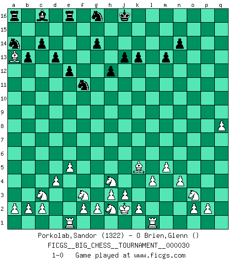 Last move : 1-0 2009 April 17 2:57:7 [Event "FICGS__BIG_CHESS__TOURNAMENT__000030"] [Site "FICGS"] [Date "2008.11.11"] [Round "1"] [White "Porkolab,Sandor"] [Black "O Brien,Glenn"] [Result "1-0"] [WhiteElo "1322"] [BlackElo ""] 1.j2-h4 h14-h13 2.h1-o7 g15-g14 3.o7-o15 p16-q14 4.o15-c4 c15-c14 5.m2-m4 n15-n14 6.n2-n4 o16-d6 7.g1-f3 d6-h2 8.k1-h2 q16-o16 9.p1-o3 e15-e14 10.e2-e4 h16-a9 11.m1-m3 q14-p12 12.c4-l12 h15-k14 13.l12-p12 o16-p16 14.b1-c3 q15-q13 15.p12-p11 p15-p13 16.p11-l15 j15-k13 17.l15-q10 k13-l15 18.q10-l15 m16-o16 19.l15-k14 k16-h15 20.k14-q8 p13-p12 21.q8-q13 p16-q16 22.q13-p12 o16-p16 23.p12-g4 b15-b13 24.f1-b5 f16-g15 25.d2-d4 q16-q10 26.c1-f4 a9-a10 27.g4-a10 q10-a10 28.m3-l3 a10-b10 29.l1-o4 b10-o10 30.o4-p3 p16-p10 31.o1-k5 o10-l10 32.l3-l10 p10-l10 33.l2-l4 m15-m13 34.k5-f9 l16-m15 35.q1-l1 m15-f9 36.b5-f9 g15-m10 37.f4-m10 l10-m10 38.e4-e5 f15-f13 39.m4-m5 m10-f10 40.f9-k5 k15-k13 41.e1-e4 d15-d13 42.e4-g4 f10-f12 43.g4-g8 f12-g12 44.g8-g12 f13-g12 45.a1-e1 e14-e13 46.q2-q4 g12-g11 47.q4-q5 a15-a13 48.p3-g11 e13-e12 49.q5-q6 b16-a14 50.q6-q7 j14-j13 51.j1-j2 h13-h12 52.g11-e9 h15-g13 53.q7-q8 g13-f11 54.e9-a13 1-0 This big chess game has been lost on time (started : 2008.11.11 3:52:52) Follow this game move after move (download)When your house is on fire, you can't be bothered with the neighbors. Or, as we say in Chess, if your King is under attack you don't worry about losing a Pawn on the Queen's side. (Gary Kasparov) Kritik überlasse ich den Spießern. Ich zeige nichts, wofür ich mich schämen muss. (Alexandra Kosteniuk) Alguna parte de un error es siempre correcto. (Savielly Tartakover) Toute estimation doit être constamment réévaluée. (Jacob Estrin) The modern world has divided itself into Conservatives and Progressives. The business of Progressives is to go on making mistakes. The business of the Conservatives is to prevent the mistakes from being corrected. (G.K. Chesterton)