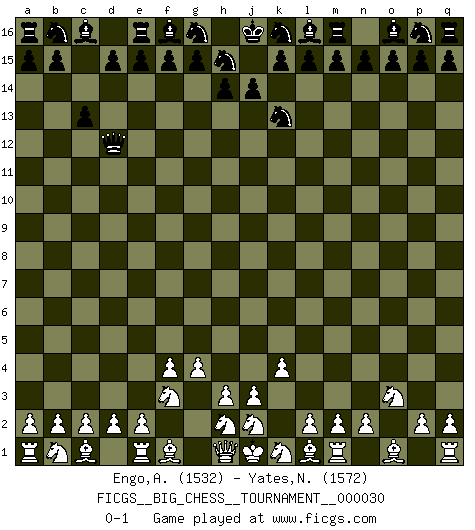 Last move : 0-1 2008 December 19 14:19:35 [Event "FICGS__BIG_CHESS__TOURNAMENT__000030"] [Site "FICGS"] [Date "2008.11.11"] [Round "1"] [White "Engo,Arne Sigvald"] [Black "Yates,Normajean"] [Result "0-1"] [WhiteElo "1532"] [BlackElo "1572"] 1.g2-g4 c15-c13 2.k2-k4 j15-k13 3.f2-f4 h16-o10 4.g1-f3 o10-o2 5.p1-o3 o2-d12 0-1 Follow this game move after move (download)You sit at the board and suddenly your heart leaps. Your hand trembles to pick up the piece and move it. But what Chess teaches you is that you must sit there calmly and think about whether it's really a good idea and whether there are other better ideas. (Stanley Kubrick) Die Auseinandersetzung mit Karpow war politisch geprägt. Er stand für das kommunistische System, wurde von dessen Repräsentanten gehätschelt. Ich war der Oppositionelle. Jeder Schachweltmeister spiegelt auch die gesellschaftlichen Verhältnisse wider. Kramnik steht für die Börsen-Generation des Neuen Markts, ideologiefrei, zahlenfixiert. (Garry Kasparov) Peones: ellos son el alma de esta partida, solos forman el ataque y la defensa. (Philidor) Ce n'est pas pour s'amuser qu'il joue aux échecs : il célèbre un culte. (Vladimir Nabokov) The greatest con, that he ever pulled... was making you believe... that he is you. (Revolver, movie)