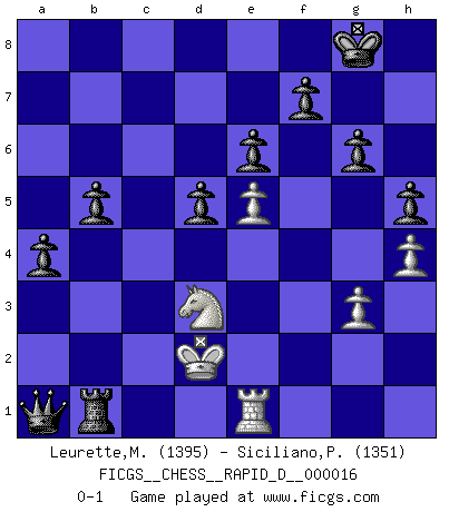 Last move : 0-1 2008 December 22 9:29:3 [Event "FICGS__CHESS__RAPID_D__000016"] [Site "FICGS"] [Date "2008.11.11"] [Round "1"] [White "Leurette,Marc-Antoine"] [Black "Siciliano,Pablo"] [Result "0-1"] [WhiteElo "1395"] [BlackElo "1351"] 1.e4 c5 2.Nc3 Nc6 3.d3 d6 4.Nf3 g6 5.Be3 Bg7 6.Qd2 Nf6 7.O-O-O O-O 8.d4 cxd4 9.Nxd4 Bd7 10.g3 Ng4 11.Bb5 Nxe3 12.fxe3 Rc8 13.h4 h5 14.Rhf1 Bg4 15.Be2 Ne5 16.Bxg4 Nxg4 17.Nd5 e6 18.Nf4 Qd7 19.Nf3 Qa4 20.c3 Qxa2 21.Qc2 Nxe3 22.Qb1 Qb3 23.Qd3 Bxc3 24.bxc3 Rxc3+ 25.Kd2 Rxd3+ 26.Nxd3 Nxf1+ 27.Rxf1 Rc8 28.Nd4 Qa2+ 29.Ke3 Rc3 30.Rd1 Qa3 31.Ne2 Rb3 32.Nec1 Rb1 33.Kd2 d5 34.e5 a5 35.Kc2 Qa1 36.Kd2 b5 37.Re1 a4 38.Nb4 Rxb4 39.Nd3 Rb1 0-1 Sicilian : Closed, 2...Nc6 Queenside Castling by player White (move 7) Kingside Castling by player Black (move 7) Player Black won this chess game. Follow this game move after move (download)For surely of all the drugs in the world, Chess must be the most permanently pleasurable. (Assiac) Die westlichen Werte sind eine Sprache, welche die Putin-Administration nicht versteht. (Garry Kasparov) En el Ajedrez, tal como en la vida, las bendiciones de hoy pueden ser el veneno del mañana. (Assaic) On peut tirer plus d'utilité d'une partie perdue que de 100 parties gagnées. (Capablanca) Computers make it easier to do a lot of things, but most of the things they make it easier to do don't need to be done. (Andy Rooney)