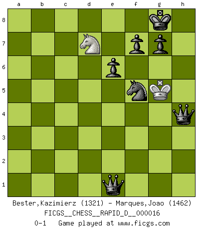 Last move : 0-1 2009 April 17 15:4:56 [Event "FICGS__CHESS__RAPID_D__000016"] [Site "FICGS"] [Date "2008.11.11"] [Round "1"] [White "Bester,Kazimierz"] [Black "Marques,Joao"] [Result "0-1"] [WhiteElo "1321"] [BlackElo "1462"] 1.e4 d5 2.exd5 Qxd5 3.Nf3 Bg4 4.Be2 Nf6 5.O-O Nc6 6.Nc3 Qd8 7.d3 e6 8.Bg5 Be7 9.h3 Bh5 10.a3 O-O 11.Bf4 Bd6 12.Bg5 Be7 13.Qd2 Qd7 14.Rad1 Rad8 15.b4 a6 16.Bxf6 Bxf6 17.Ne4 Qe7 18.Rde1 Na7 19.Nxf6+ Qxf6 20.Nh2 Bxe2 21.Rxe2 Nb5 22.Re4 Qb2 23.Qg5 Qxc2 24.Ng4 Qxd3 25.Re3 Qg6 26.Qxg6 hxg6 27.a4 Nd4 28.Ne5 Nf5 29.Rd3 Nd6 30.Rc3 c6 31.f3 Nf5 32.Kh2 Rd5 33.f4 Rfd8 34.g4 Ne7 35.h4 Rd4 36.Rc4 Rxc4 37.Nxc4 Rd4 38.Ne5 Rxb4 39.f5 gxf5 40.gxf5 Nxf5 41.h5 Rxa4 42.Rg1 Rh4+ 43.Kg2 Rxh5 44.Nd7 Rg5+ 45.Kf2 Rxg1 46.Kxg1 a5 47.Nc5 b5 48.Kf2 a4 49.Nd3 a3 50.Nb4 c5 51.Nc2 a2 52.Kf3 b4 53.Ke4 b3 54.Na1 b2 55.Nb3 a1Q 56.Nxc5 Qe1+ 57.Kf4 b1Q 58.Nd7 Qbe4+ 59.Kg5 Qeh4+ 0-1 This chess game has been lost on time (started : 2008.11.11 17:44:20) Scandinavian (centre counter) defense Kingside Castling by player White (move 5) Kingside Castling by player Black (move 10) 10 pieces endgame at move 46 : White KN , Black KNPPPPPP WHITE : King + 1 Knight BLACK : King + 1 Knight 6 Pawns Promotion Queen by player Black (move 55) 9 pieces endgame at move 56 : White KN , Black KQNPPPP WHITE : King + 1 Knight BLACK : King + 1 Queen 1 Knight 4 Pawns Promotion Queen by player Black (move 57) Player Black won this chess game. Follow this game move after move (download)Chess is mental torture. (Garry Kasparov) Stelle das Brett so, daß die Sonne in die Augen deines Gegners scheint. (Ruy López) A la fecha, Fischer esta simplemente un nivel arriba de todos los mejores jugadores de Ajedrez del mundo. (John Jacobs) Des points faibles ou des trous dans la position de l'adversaire doivent être occupés par des pièces et non pas par des pions. (Siegbert Tarrasch) Live, lose, and learn, by observing your opponent how to win. (Amber Steenbock)