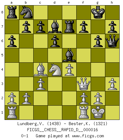 Last move : 0-1 2008 November 28 15:32:58 [Event "FICGS__CHESS__RAPID_D__000016"] [Site "FICGS"] [Date "2008.11.11"] [Round "1"] [White "Lundberg,Viktor"] [Black "Bester,Kazimierz"] [Result "0-1"] [WhiteElo "1438"] [BlackElo "1321"] 1.e4 e5 2.Nf3 d6 3.d4 exd4 4.Nxd4 a6 5.Nc3 Qe7 6.Be3 g6 7.Qd2 Bg7 8.Be2 Bd7 9.O-O Nf6 10.Nd5 Qd8 11.Nxf6+ Bxf6 12.c3 O-O 13.Bh6 Re8 14.Qf4 Be5 15.Qf3 Qh4 16.h3 Qxh6 17.Bc4 Re7 0-1 Philidor : Exchange variation Kingside Castling by player White (move 9) Kingside Castling by player Black (move 12) Player Black won this chess game. Follow this game move after move (download)In the perfect Chess combination as in a first-rate short story, the whole plot and counter-plot should lead up to a striking finale, the interest not being allayed until the very last moment. (Yates and Winter) Der Schachmeister von Heute braucht Courage, einen Killerinstinkt, Ausdauer und Arroganz. (Larry Evans) Por la belleza de sus partidas, la claridad de su juego y lo brillante de sus ideas, Fischer se creó el mismo como un artista de la misma estatura como Brahms, Rembrandt y Shakespeare. (David Levy) RxDa4 pat (...) You think that education is too expensive ? Try ignorance. (Derek Bok)